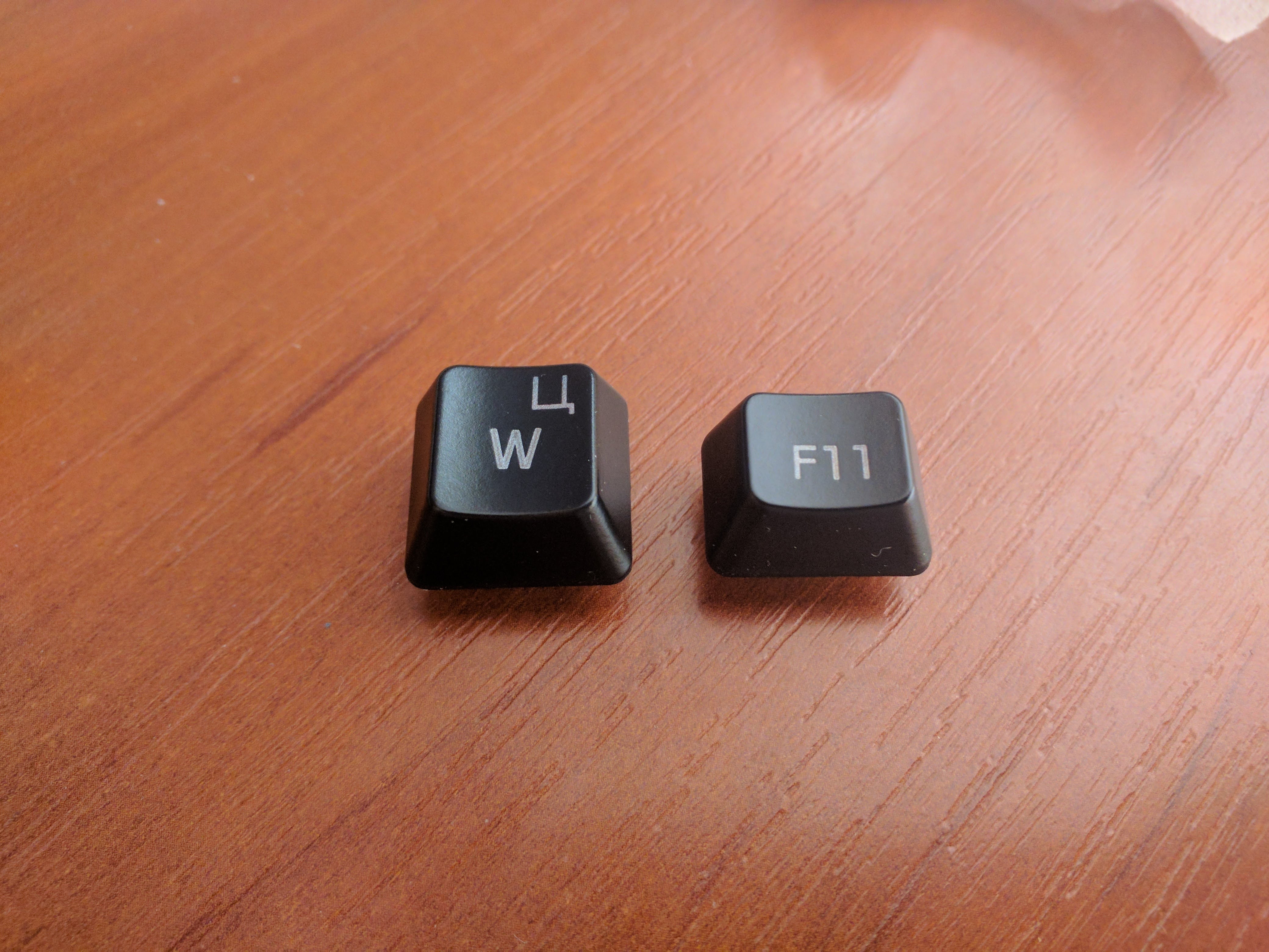 Logitech G11. Клавиатуре лет 10, использовалась сверх активно, пережила тысячи часов в играх и тонны напечатаного текста. ABS пластик(на 100% не уверен, но не думаю что pbt). Сравнение кнопок W и F11(которая нажималась раз в год, а то и реже):