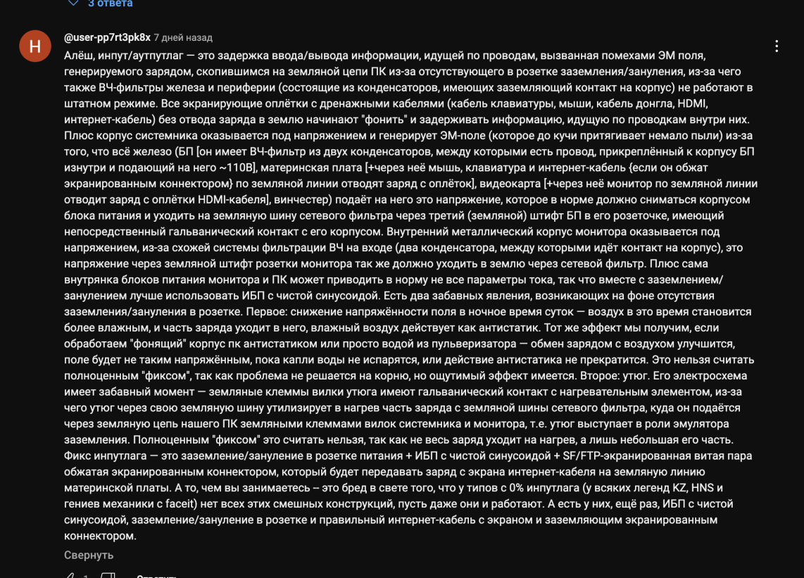 Ну в общем, уже давно я наблюдаю аномалии в вводе/вывода мыши - инпут лаг, не только у себя, но и у других людей, проблема известная, у кого то с этим дела обстоят лучше, у кого то хуже. Сам по себе стабильный,ровный инпут лаг не так страшен, как плавающий, ибо он уже большая проблема в таких шутерах как Counter Stirke. Этой проблемой стал интересоваться еще в нулевых годах. И никак не мог разобраться в чем дело. Не давно стал более пристально изучать проблему заземления ПК, обратил внимание на факт того, что заземление необходимо еще и для увода накопленного электростатического заряда в землю. Ну и сообразил до следующего момента: 1. Электростатический заряд есть и тогда, когда мы его физически еще не воспринимам, не чувствуем, то есть он достаточно мал и человеческое тело его не ощущает. 2. Общеизвестный факт, что трение тел некоторых создает электростатический заряд. Ну и вывод что я сделал: движение мыши по коврику создает электростатический заряд, он мал и не чувствуется, он различен в разных частях коврика, вокруг любого электростатического заряда образуется электрическое поле (школьный курс физики), движение же тела в электрическом поле создает уже электромагнитное поле (из уроков физики школы), а электромагнитные волны воздействуя на НЕ экранированную электронную плату мыши создает в ней помехи, а отсюда и аномальный, плавающий инпут лаг. Решение: после протирки коврика и мыши чистящим средством для компьютерной периферии, в содержании которого, есть антистатик, ситуация с инпут лагом стала заметно лучше. Вопрос прав ли я, или же это плацебо. Но в counter strike стало просто волшебно играть, гораздо легче прицеливаться.