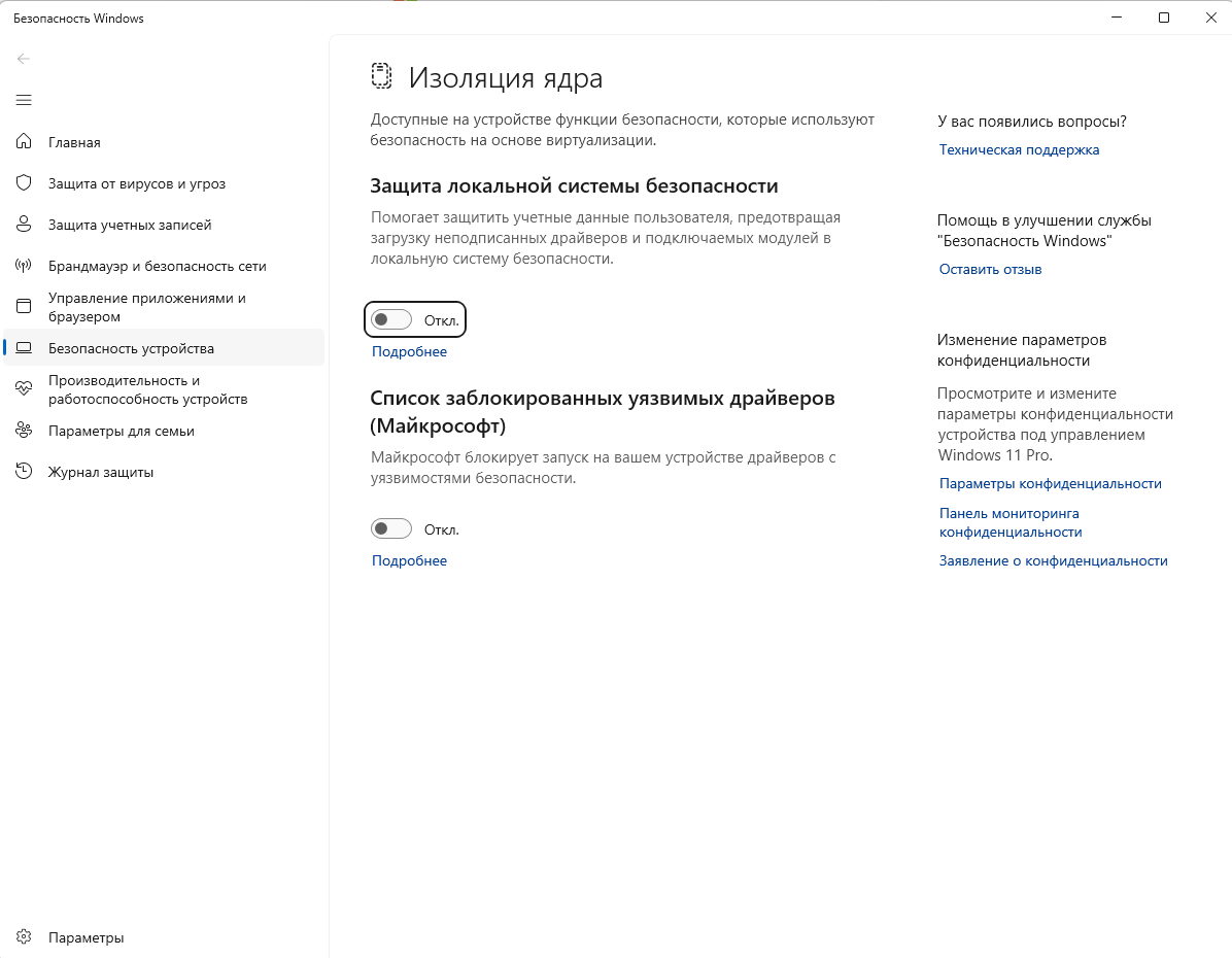 Магистр_Мёда ну да, либо виртуализацию грохаешь в биос, тогда только драйвера надо отключить и девайсгард (в чистой установке обычно ДГ нет в реестре, и ничего допом делать не надо, просто проверь). Если изоляция есть в настройках, то достаточно только там. Просто бывают нюансы с ее наличием