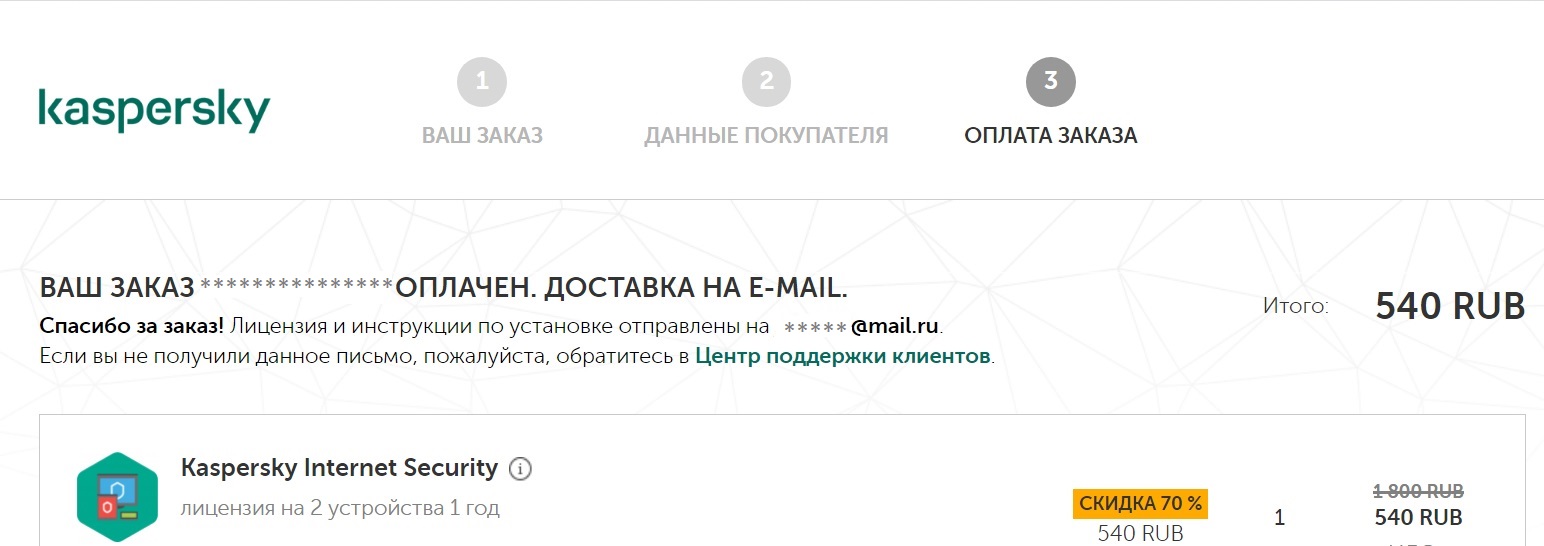 1. Заходим на официальный сайт Лаборатории Касперского. 2. Выбираем версию Personal на 3 устройства 3. Отключаем автопродление 4. Нажимаем Купить 5. Слева внизу в пункте "У меня есть промокод" вводим промокод: PR0041842 6. Нажимаем Активировать промокод 7. Проверяем что цена изменилась и промокод активировался. 8. Нажимаем Продолжить 9. Далее оформляем заказ и оплачиваем.
