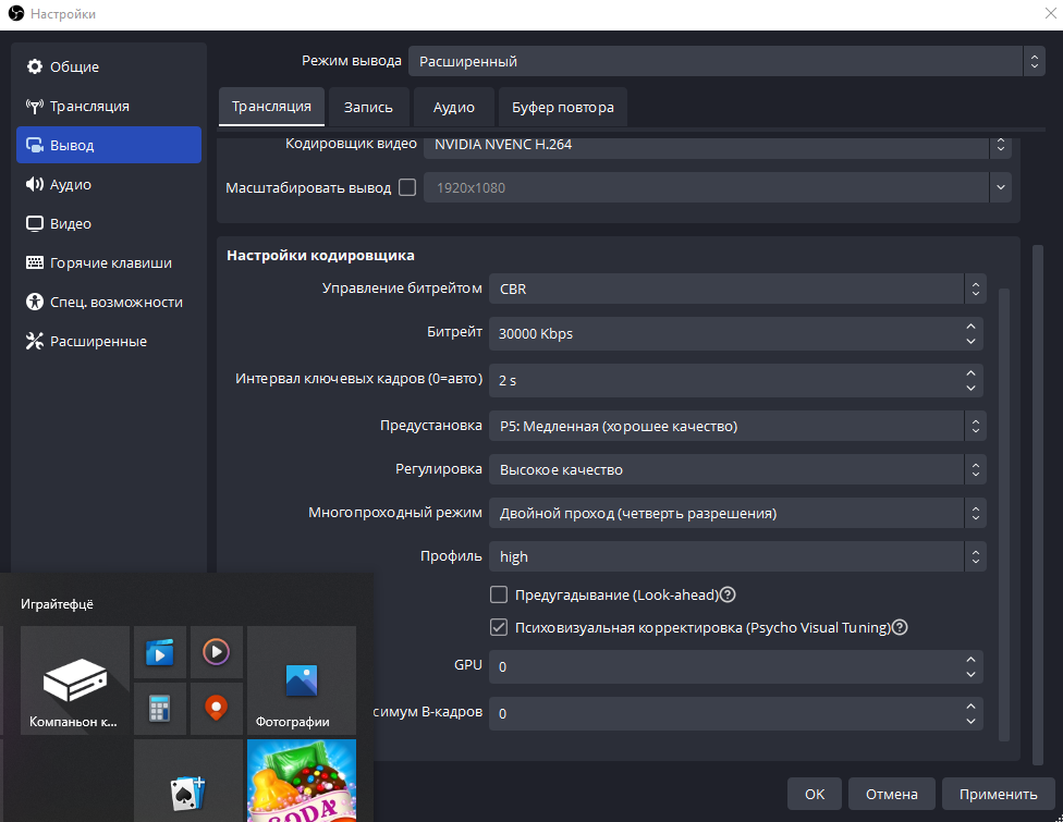 Всем привет) у меня следующая проблема с ОБС при запуске грузит видеокарту на 50-85% в графе 3D и это без записи, если смотреть через диспетчер задач виндовс( я решаю эту проблему так в geforce expirience просто нажимаю переустановить драйвер и все нормально работает в ОБС и в диспетчере задач видеокарта не нагружается пока не включишь стрим. Как включишь то нагрузка в разделе 3D минимальна, а в разделе кодировщик ну примерно 40-50% проблем с записью игр нет все хорошо, но стоит перезагрузить пк все по новой возвращается(. Подскажите в чем проблема. Мой пк видеокарта 3090 (пробовал разные драйвера не помогает) проц 10900 материнка на Z490 и ОЗУ 32Гб винда 10 оригинал 2 монитора и 1 вебкамера основной монитор 144Гц было все хорошо но уже в течении 2 месяцев так происходит кто-то уже сталкивался с этим? Подскажите как исправить? просто нет желания переустанавливать виндовс и все заново настраивать когда нет гарантии что может вернуться обратно(
