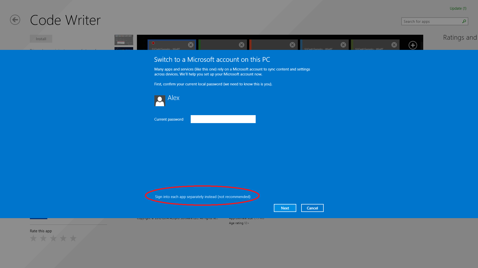 У меня на стационарном компе уже больше года Windows 8.0 и там без проблем у меня сожительствуют и классическая учетка и работающий Windows Маркет... подскажите, где я что прошляпила на Windows 8.1?