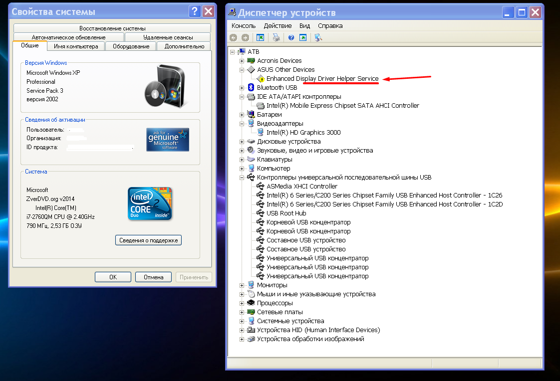 Приветствую всех! ) Имеется ноутбук Asus k53sd (i7-2760qm/Nvidia 610m 2gb/ 16gb RAM/SSD 250gb/HDD 500gb). В ноутбуке стоит две ОС: Win 10 x64 последней версии и Win XP 32bit. При включении ноутбука предлагается выбор, какую загружать ОС. Виндовс 10 работает нормально с 2019 когда её установил на SSD. На официальном сайте Асус нет драйверов для ХР, друг, когда её устанавливал в 2019 году использовал драйвера для Win 7 32bit. Работает ХР нормально, не работает дискретная графика Нвидиа из-за отсутствия драйверов, но для вывода изображения хватает встройки HD Graphics 3000, на ноутбуке старые программы запускаю. Такой вопрос: на Вин 10 вентилятор СО работает по температуре (в браузере выключен, при просмотре фильмов еле слышно его /1700-2300 об/, при какой-то работе раскручивается до 3500 об, летом очень редко крутится на максимум 4800 об/), а вот на Вин ХР вентилятор всегда крутится на максимум. Только включил ноутбук и сразу на максимум на холодном процессоре, шум от него мешает.Может какой драйвер установить нужно, выложил Диспетчер Устройств, подскажите в какой графе обновить драйвер или наоборот установить старый драйвер.Может через реестр можно вообще выключить вентилятор и чтоб было пассивное охлаждение или какую стороннюю программу посоветуете для управления вентилятором? Вин 10 обновлялся постоянно, это же не влияет на ХР, который стоит на другом разделе? В Диспетчере Устройств стоит знак восклицания - это фирменная утилита Асус для Нвидиа, нет драйверов на неё для ХР. К ноутбуку подключен внешний старенький монитор через кабель VGA, потому что подсветка матрицы на ноутбуке перегорела и пока нет возможности поставить новую матрицу. Если будут вопросы, выложу более подробные скрины, какие потребуются. Спасибо )