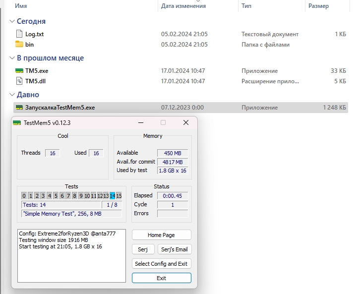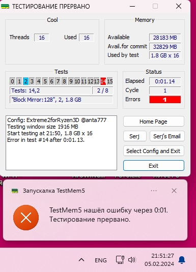 потестил запускалку c 2012/19** окном + extreme2forRyzen3D_anta777.cfg и чтот есть мнение, что долго ли коротко, но обычно на 3 цикле выпадает ошибка. из последнего: запустил 2012 получил ошибку 14 на 3 цикле ближе к концу( там где 2,8,14,2,*) потом запустил(без перезагрузки) v2023.12.06.2 до окна которая(как я понял) и нормально уже прошло↓