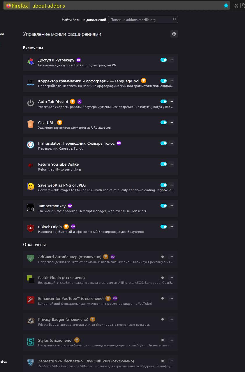 Для повышения удобства работы с браузером вы можете устанавливать расширения, а для изменения внешнего вида браузера - темы. Также расширения можно искать в окне установленных расширений браузера (about:addons).