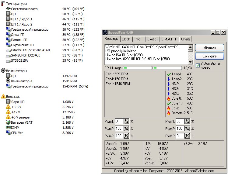 Q: Как узнать, чему соответствуют датчики температуры Temp1, Temp2? A: Запустите параллельно AIDA и найдите одинаковые показания. Переименуйте прежние названия в желаемые.