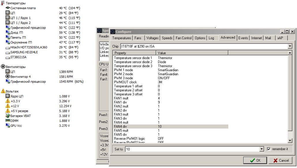 Q: Обороты вентилятора 0\огромные значения. В других программах нормально. А: Измените в настройках I\O чипа (Configure - Advanced) сначала значение Fan Div, если не поможет - Fan Mult.