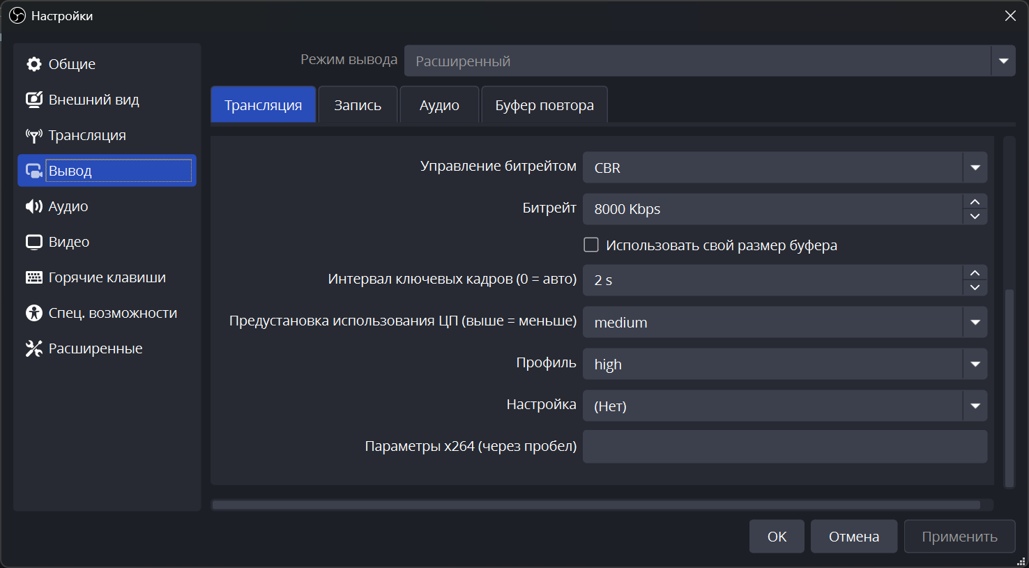 Здравствуйте. Подскажите пожалуйста по настройкам. Для пресета fhd x264 medium , 8000kb\s , нужно что прописывать в строку ? Мб есть какие команды чтоб немного улучшить кач-во. Стрим идёт через МиниПК Ryzen 8845hs по NDI. В Расширенных настройках Цвет пространство rec.709 , Цветовой диапозон Полный. Ланцоша