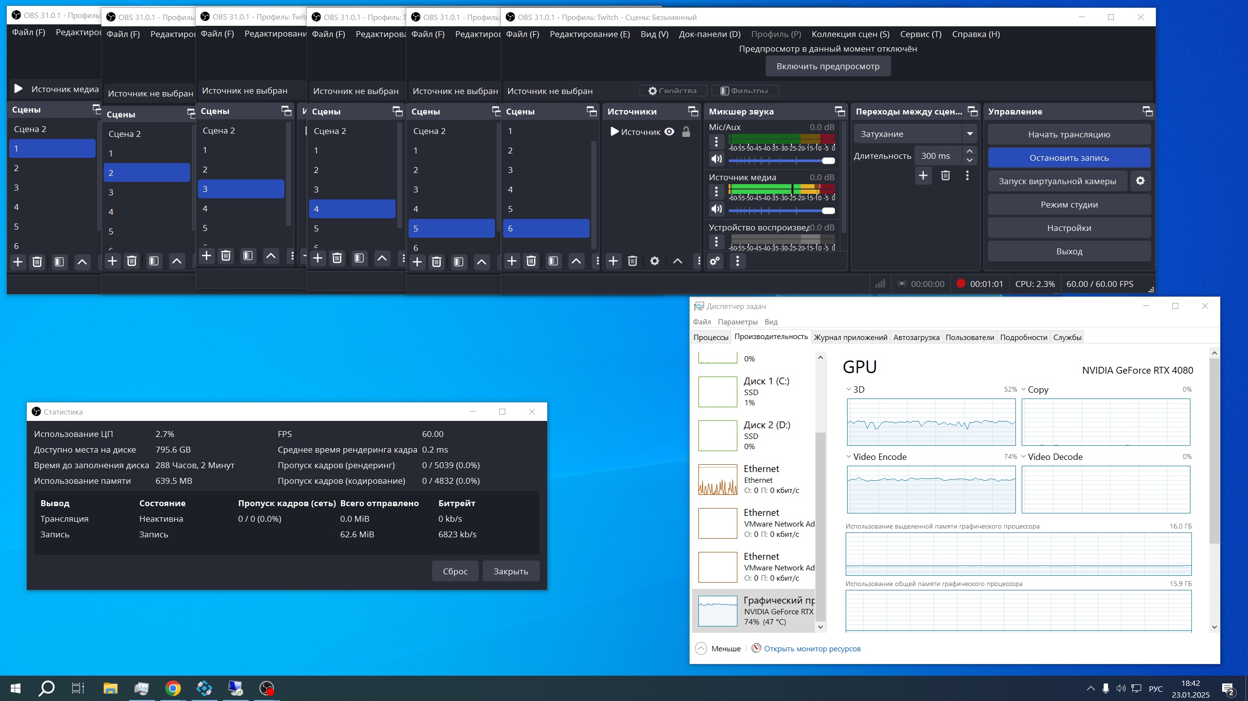 Максимальные настройки, с которыми можно впихнуть 6 потоков 1080/60 6мбит на 1660 это P4: Среднее качество. При таких настройках энкодер загружен на 79%