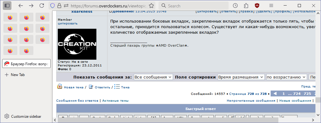 При использовании боковых вкладок, закрепленных вкладок отображается только пять, чтобы увидеть остальные, приходится пользоваться колесом. Существует ли какая-нибудь возможность, увеличить количество отображаемых закрепленных вкладок?
