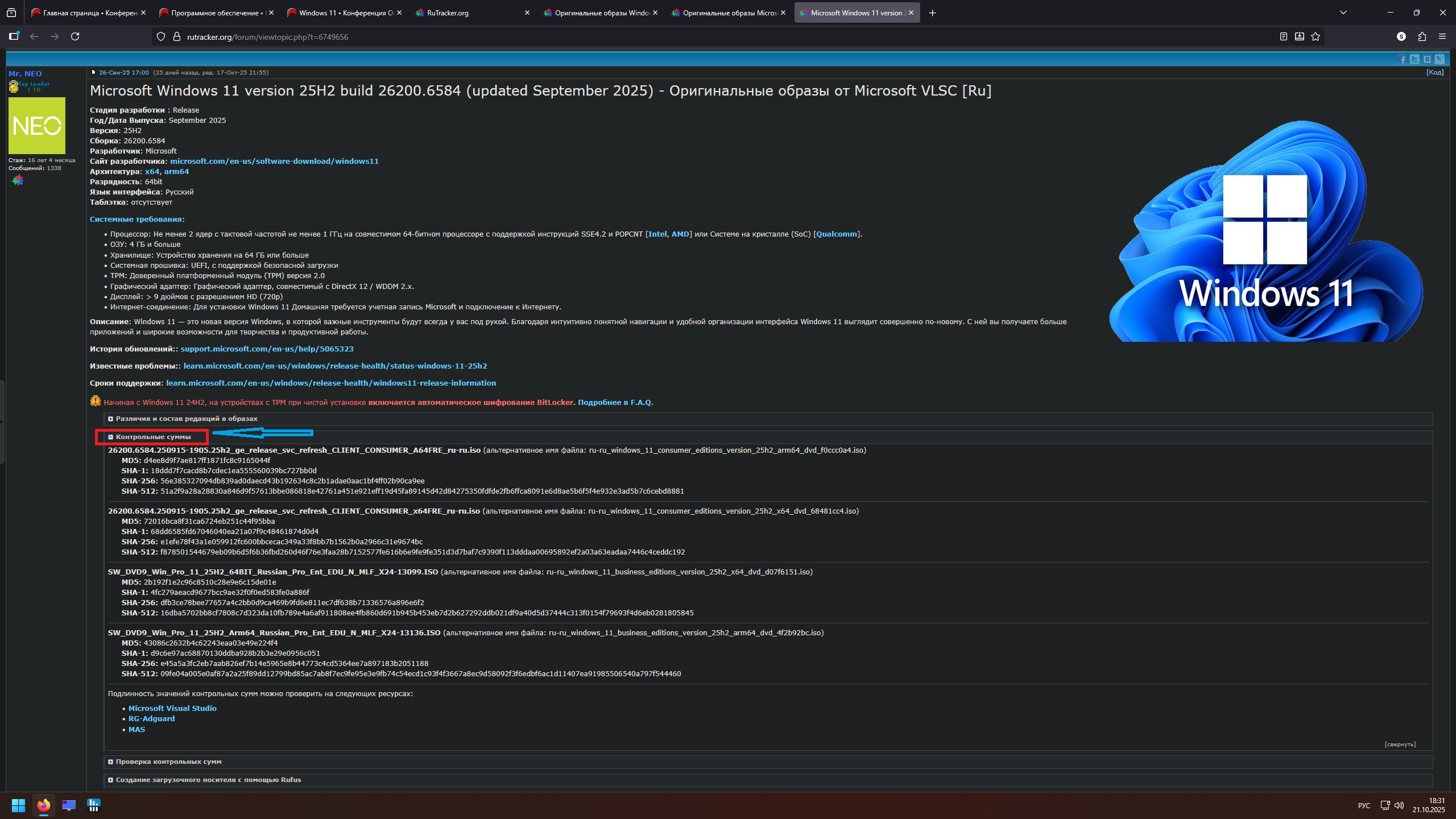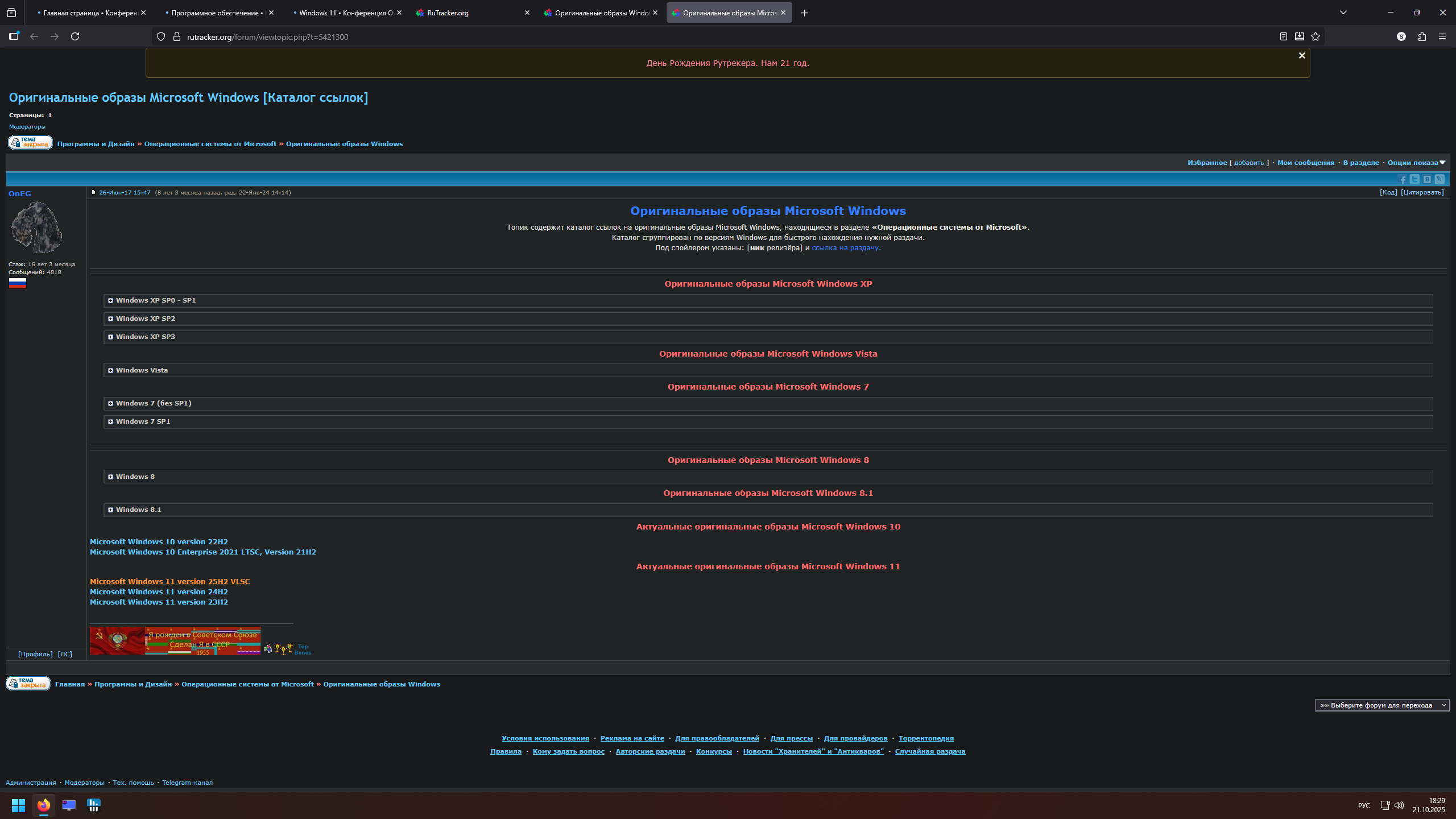 Всем привет. Я уже долго оттягивал переход на 11 версию окон. Но уже купил новое железо и ставить ориг 10ку в конце 2025 уже не комильфо учитывая что скоро поддержка может закончиться. С официального сайта мелкомягких скачать образ нельзя по известным причинам. Поэтому возникает вопрос: Где лучше скачать оригинальный образ Windows 11? То есть где можно БЕЗОПАСНО скачать образ с максимально последней версией? На торрентах много вариантов "оригинальных образов", но тк я давно не мониторил, я сейчас не в курсе кому из авторов на рутрекере можно доверять. Может есть сайты где все проверено и можно качать не опасаясь установить ОСь с вредоносным ПО ?