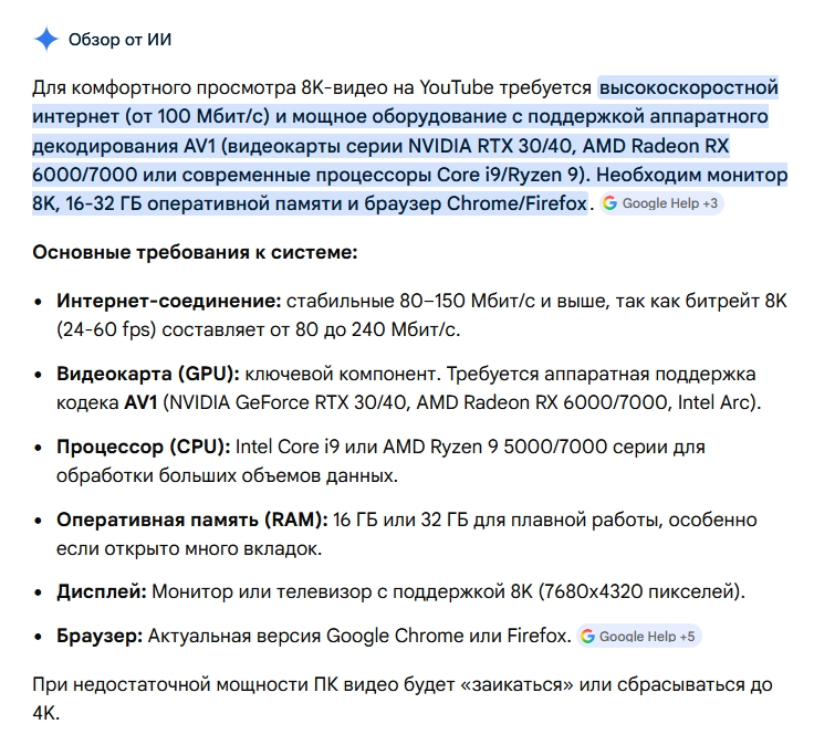 Какой ПК нужен для просмотра 8K на youtube? У меня дико тормозит, процессор грузит до 99%, интернет грузит до 50мбит/с (возможно из-за недостаточной пропускной способности интернета в 100Мбит/с)