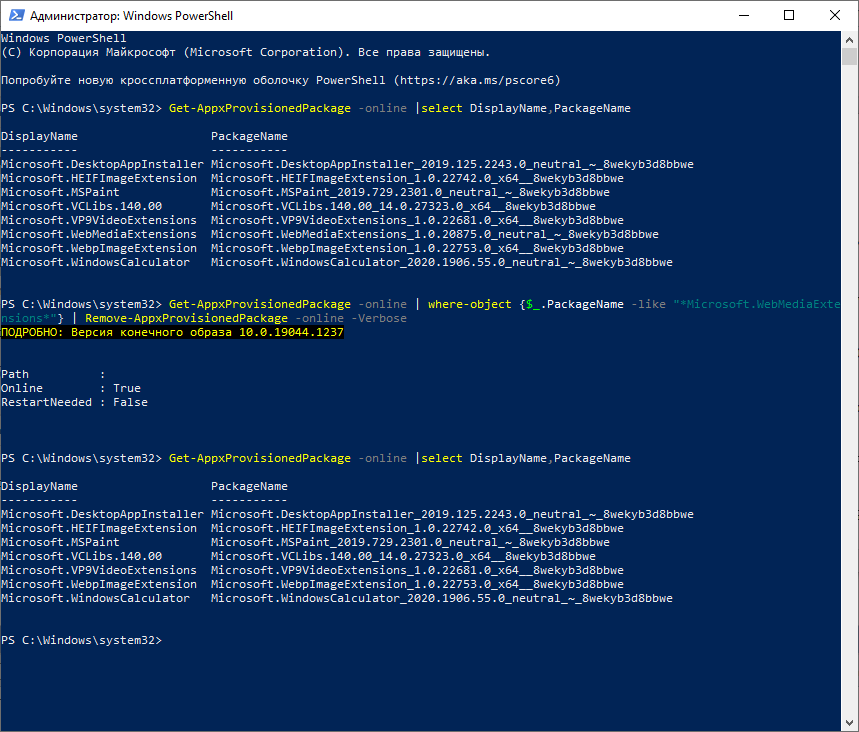 Remove-AppxPackage : Сбой удаления. Обратитесь к поставщику программного обеспечения. Произошел сбой операции развертывания Remove с конечным томом C: для пакета Microsoft.WebMediaExtensions_1.0.20875.0_x64__8wekyb3d8bb we из . Ошибка: 0x80070002. Для получения справки по диагностике проблем с развертыванием приложений см. страницу http://go.microsof t.com/fwlink/?LinkId=235160. C:\Users\NT\Desktop\123\!\!Del App My.ps1:49 знак:50 + ... xPackage *Microsoft.WebMediaExtensions* | Remove-AppxPackage -AllUser + ~~~~~~~~~~~~~~~~~~~~~~~~~~~ + CategoryInfo : NotSpecified: (:) [Remove-AppxPackage], COMException + FullyQualifiedErrorId : System.Runtime.InteropServices.COMException,Microsoft.Windows.Appx.PackageManager.Commands.RemoveAppxP ackageCommand