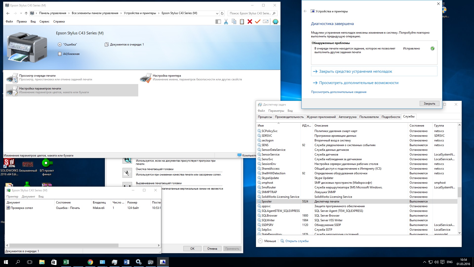 Здравствуйте! Я прошу прощения, скорее всего не в той теме пишу вопрос, но я тут первый раз, если что, ткните, пожалуйста, куда задавать и я исправлю. После установки вин10 появилась проблема с печатью. Все майкрософтовские способы исправления не работают, прилагаю скриншот экрана, как выглядит проблема. Подскажите, пожалуйста, куда копать. Драйвера установлены корректно, сносил и переустанавливал не один раз, на 7-ке принтер работал. Буду благодарен за любую помощь.