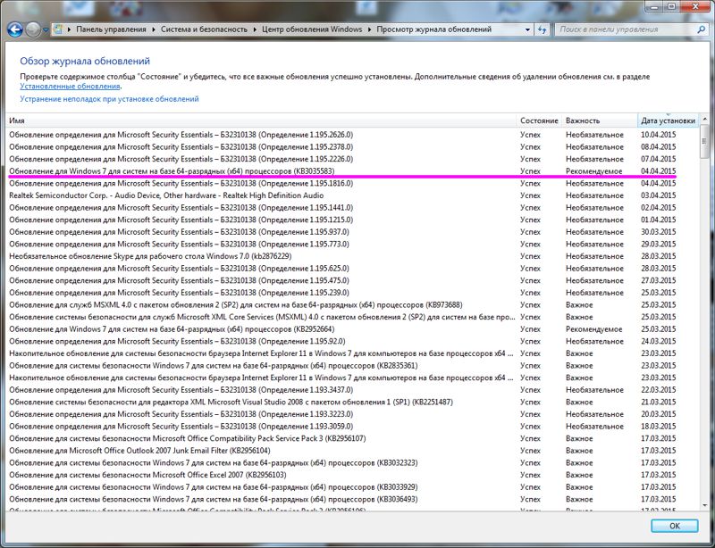 Обновление для Windows 7 для систем на базе 64-разрядных (x64) процессоров (KB2952664)
