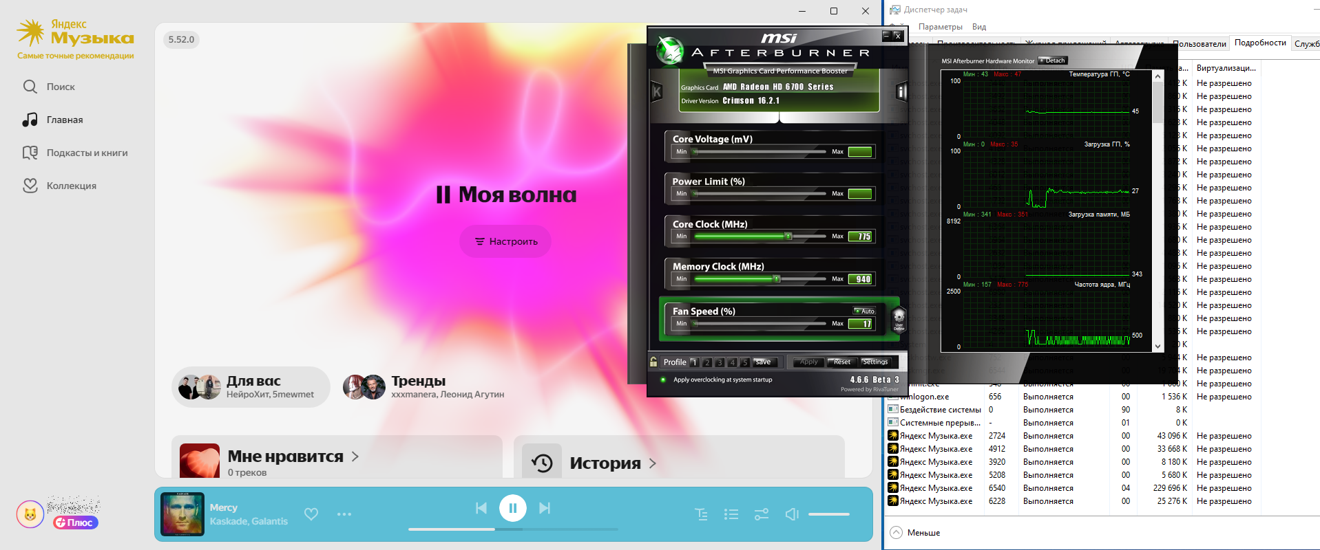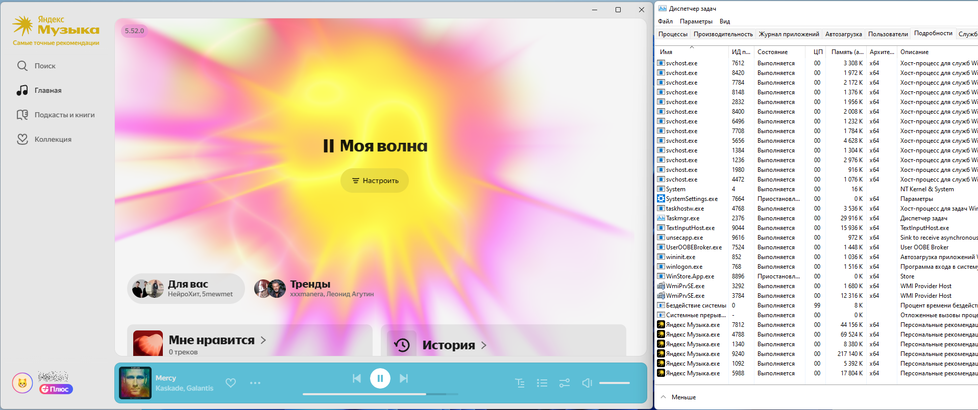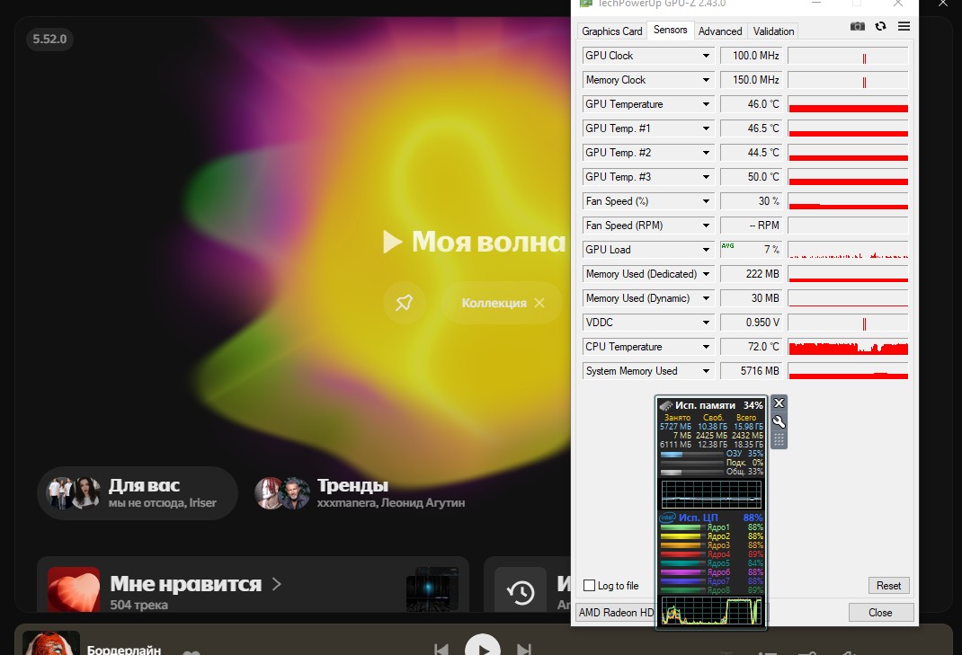 Проц (1240 v5) отдыхает, видюха, что в приложении, что в браузере, тоже, частота скачет, загрузка невысокая. Энергопотребление (1240 v5 / 16 GB двухканал DDR4 / Gigabyte Z270P-D3-CF / AMD HD 6790 / SSD NVMe 512 GB / 2х3,5 HDD / Asus Xonar DX) : Комп в простое - 82 Вт Я.музыка приложение 5.52.0 / в Opera (Opera One (версия: 119.0.5497.40)) - 97 Вт (загрузка видюхи 3-15 %) Я.музыка в Яндекс браузере (Версия 25.4.1.1055 (64-bit)) - 100 Вт