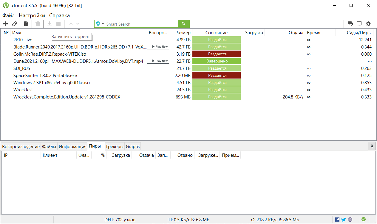 Скачал портативный Репак 3.5.5 46206 из интернетов без реклам и со всеми Про плюшками вместо старой 2.2. Подозревал, что ко мне уже часть пиров по какой-то причине подконнектиться не может. Теперь рад как слон, можно ещё 10 лет сидеть. Проц может грузить не столько торрент, сколько всякие кэши на большой скорости - как в самом клиенте, так кэш винды, вендора (у самсунговских SSD есть)... Всё-таки уже на 100Мбит/с качаем, а не на 0.1, как в 2007. Единственное что столбец "Воспроизведение" постоянно появлялся после перезапуска. Пришлось сдвинуть вправо и уменьшить ширину до нуля.