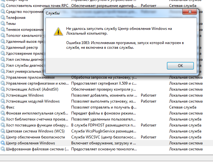 Подскажите, не могу установить обновление безопасности выскакивает ошибка 0x8007043b, WindowsUpdadeDiagnostic показывает вот такую картину (см. скрин) причём пишет что службы центра обновления запущены. В Службах не активен пункт "Центр обновления Windows" но запустить его не могу выскакивает такая ошибка (см.скрин). Подскажите, кто что думает пожалуйста.