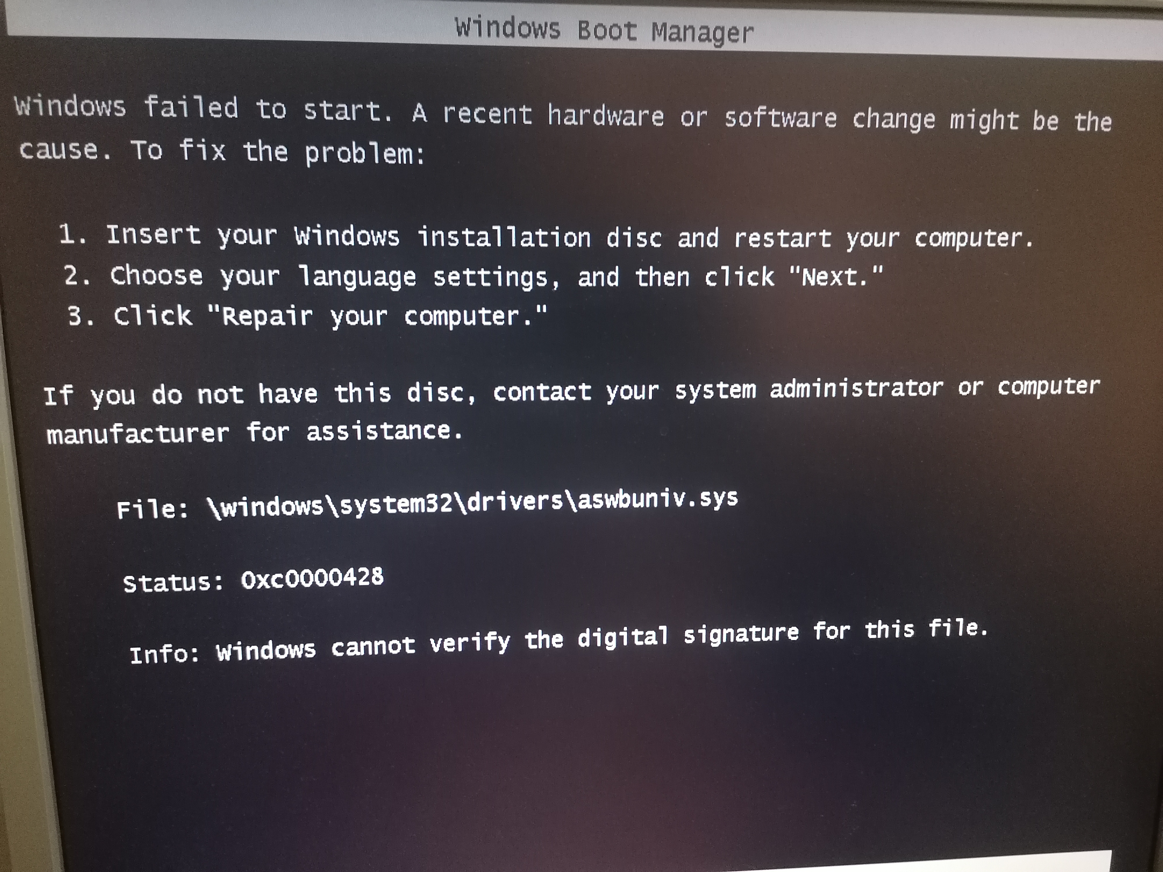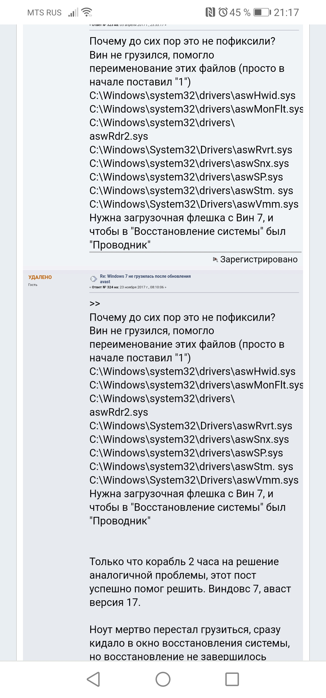 Добавлено спустя 37 минут 38 секунд: Всё, уррааа! Заработало! Антивирус Аваст не давал загружаться. Переименовал файлы указанные в приложеном скрине с форума Аваста, ещё пару раз при загрузке винда ругнулась на какие-то файлы, не указанные в скрине, их тоже переименовал. И всё, запустилось! Всем спасибо!