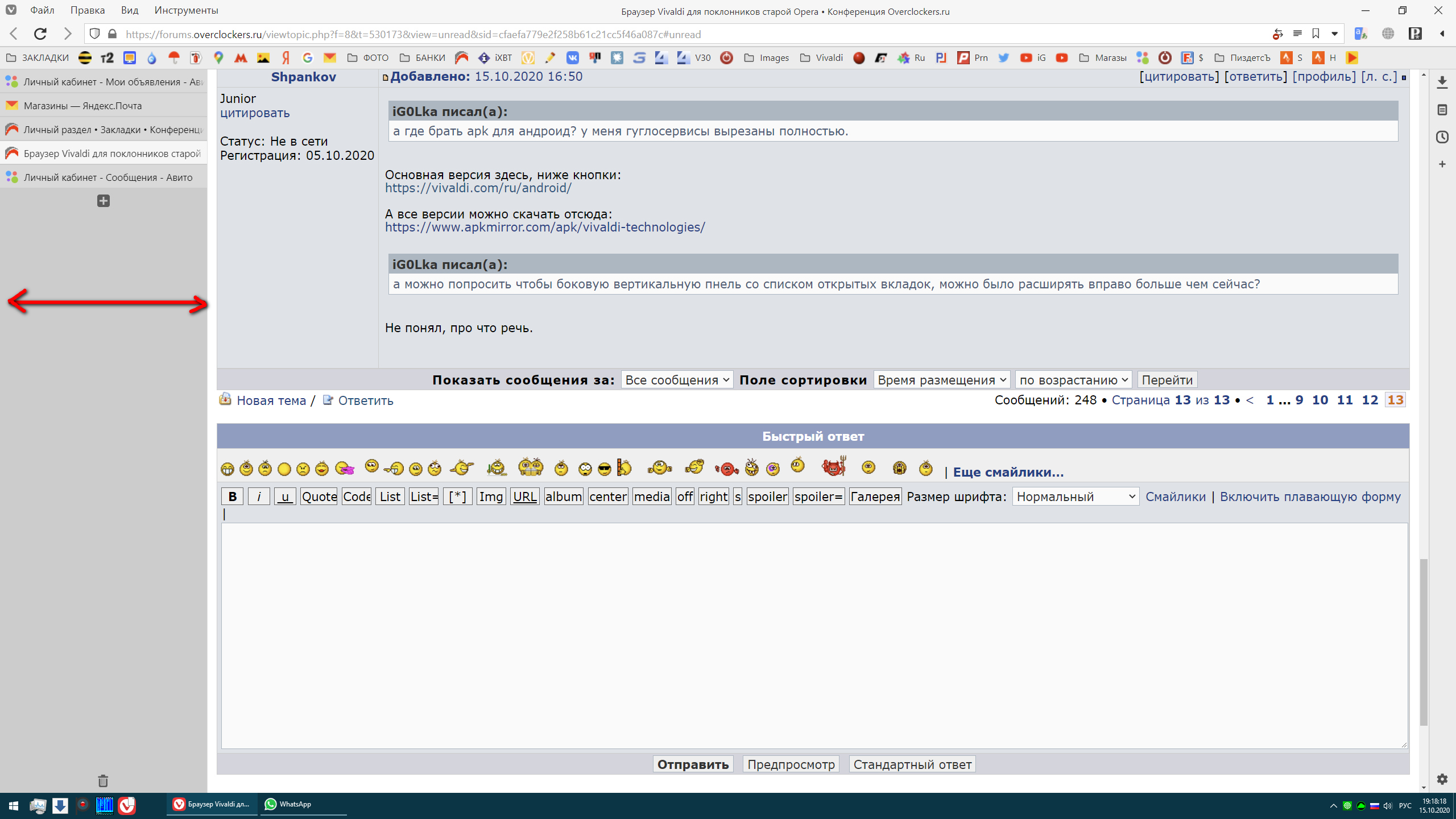 Добавлено спустя 3 минуты 3 секунды: Shpankov а можно попросить чтобы боковую вертикальную пнель со списком открытых вкладок, можно было расширять вправо больше чем сейчас? пикселов на 100 хотябы. А то экран широкий и смысла жаться влево совсем нет.