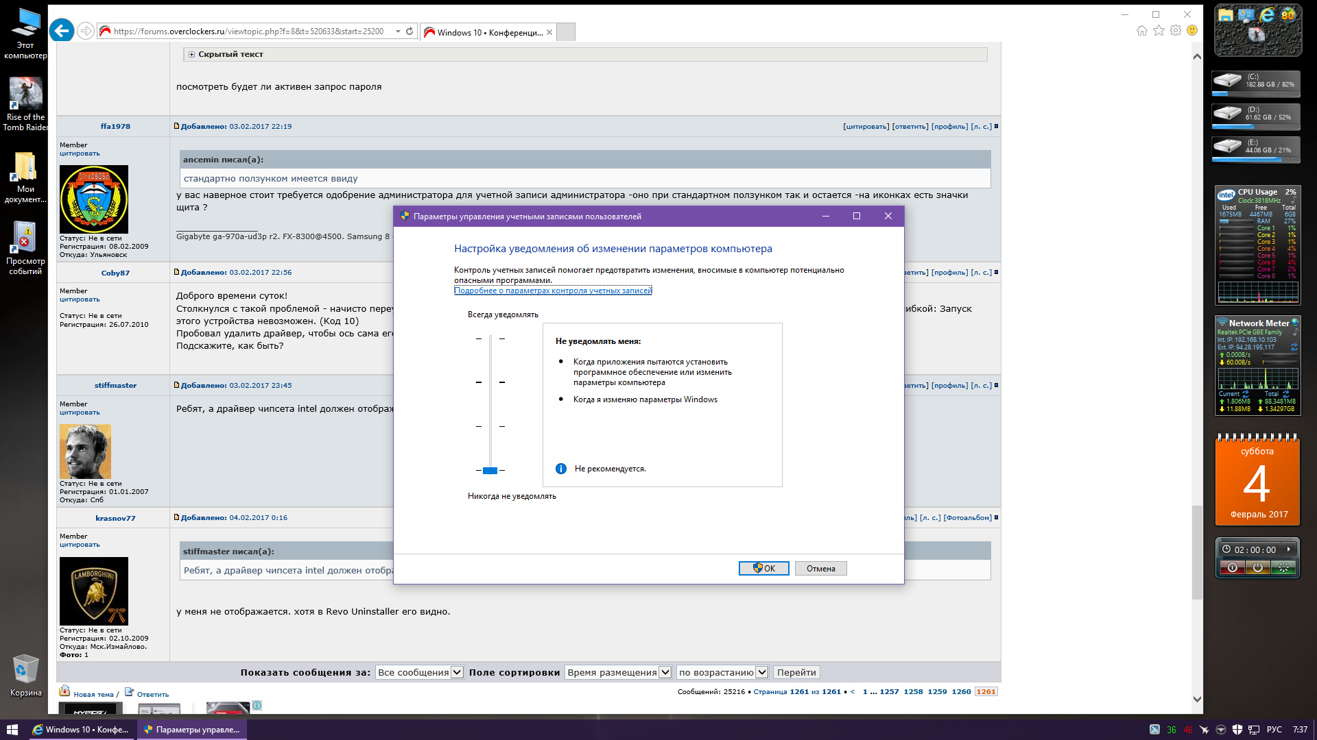 у вас наверное стоит требуется одобрение администратора для учетной записи администратора -оно при стандартном ползунком так и остается -на иконках есть значки щита ?