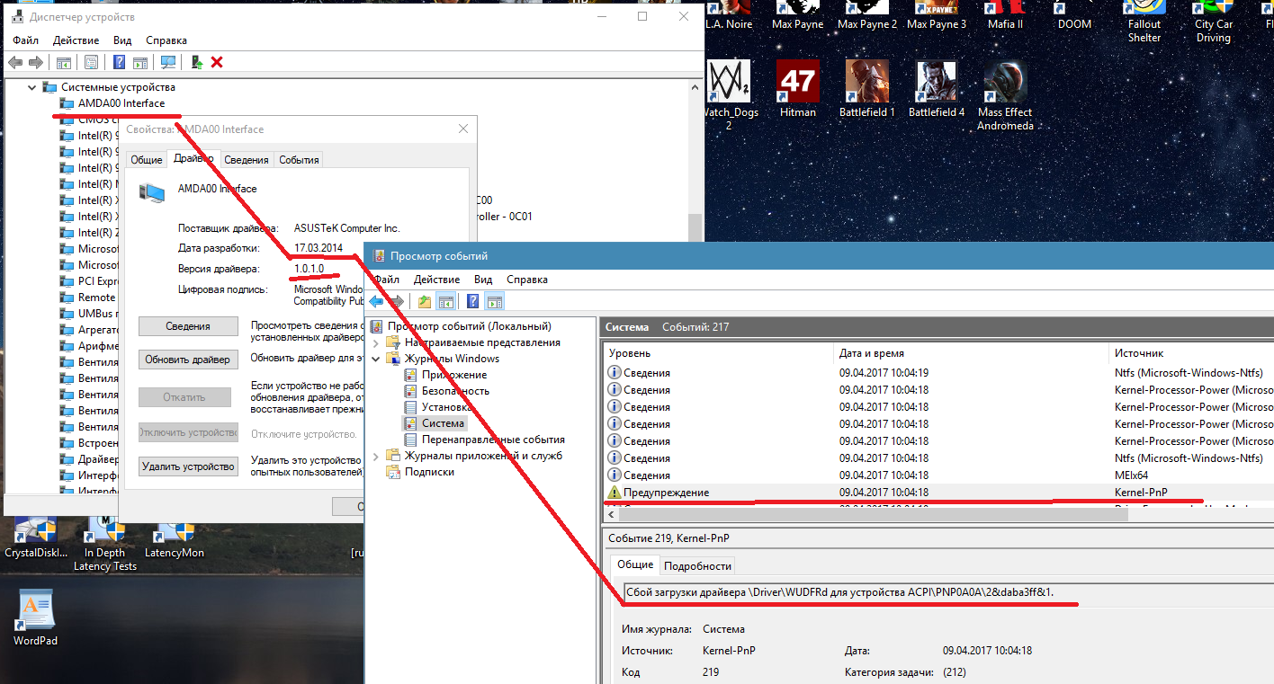 Кроме этих у меня вот такая есть: Event ID 219 - The driver \Driver\WUDFRd failed to load for the device ACPI\PNP0A0A\2&daba3ff&0. Это имеет отношение к (Asus) AMDA00 interface - в device manager пишется This device is working properly. Никто не знает как это вылечить?