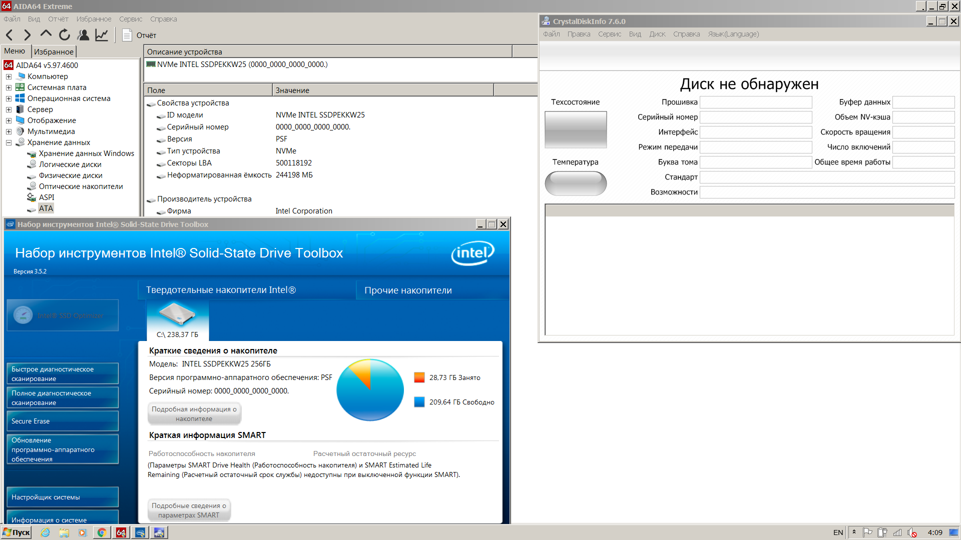 Интегрировал всё по инструкции GrandGT, какой-то файл не подхватился - iaStorA.sys (он же самый большой из .sys к SSD, видимо от этого и нижеописанная проблема - из-за его отсутствия), после создания образа ещё потребовалось интегрировать USB 3.0 драйвера с помощью Win7-USB3.0-Creator-V3, так как установка останавливалась на сообщении что-то про драйвера CD-привода (которого нет), не помню уже точно. Windows 7 успешно установилась, с драйверами и программами всё более-менее в порядке прошло тоже, но у самого накопителя, как выяснилось, не работает SMART. Хотя все тесты скорости в AIDA64 и в CrystalDiskMark, например, проходит успешно. Но сколь либо подробных данных по SSD нет ни в AIDA64, ни в Intel SSD Toolbox, ни в CrystalDiskInfo, страница SMART в AIDA64 пустая, то есть вообще ничего.