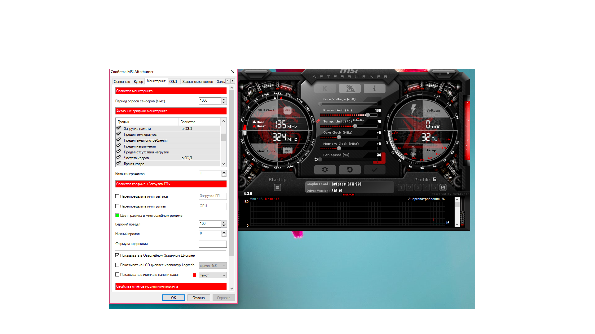 1. Для разблокировки разгона в файлеMSIAfterburner.cfg (Находится в папке, где установлена программа) необходимо прописать следующие значения: UnofficialOverclockingEULA = I confirm that I am aware of unofficial overclocking limitations and fully understand that MSI will not provide me any support on it UnofficialOverclockingMode = 1 2. Для разблокировки напряжения и его мониторинга в том же файле прописываем следующие значения: UnlockVoltageControl = 1 UnlockVoltageMonitoring = 1 (!)В драйвере Catalyst 12.2+ не хватает пары файлов, скачиваем здесь 3. Программа так же "умеет" отображать энергопотребление CPU и GPU в играх. ~ Для этого в Настройках (Настройки > Мониторинг) нужно активировать пункты "Энергопотребление" и "Энергопотребление ЦП". 4. После перезагрузки или включения компьютера слетает профиль разгона. Как сделать, чтобы он грузился вместе с Windows? ~ Одно из решений тут - настройка автозапуска ~ Или штатный метод попробовать, описанный здесь 5. Выскакивает ошибка "В данный момент невозможно произвести внедрение в Diretc3D12 компоненты. Строго рекомендуется перезапустить приложение" Решение описано в этом посте 6. Шпаргалка по оформлению оверлейного дисплея от камрада y0121ck - ОСНОВЫ и ДОПОЛНЕНИЕ