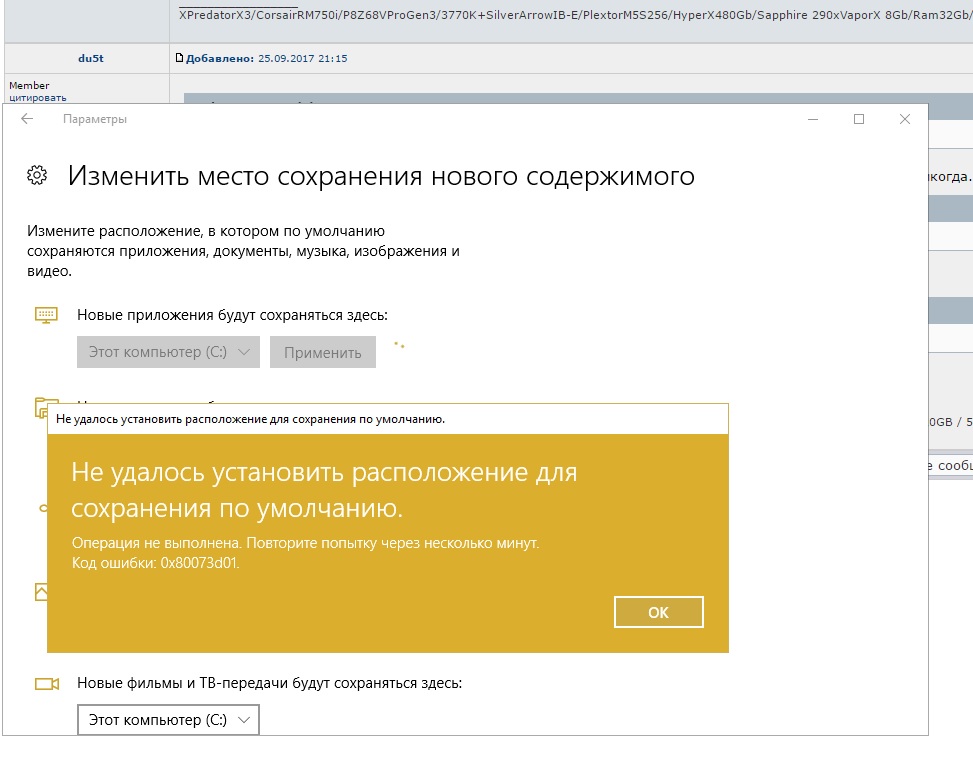Подскажите . Win10 Pro 1703 пропала возможность переноса игр/приложений на другой хард , так же изменить место сохранения нового содержимого по умолчанию. При попытке переноса/установки нового места по умолчанию, возникает ошибка 0x80073d01 Но место то на диске С не резиновое, игры тяжелые (50+Гб) , раньше переносилось без проблем. Может есть какое то решение данной проблемы?