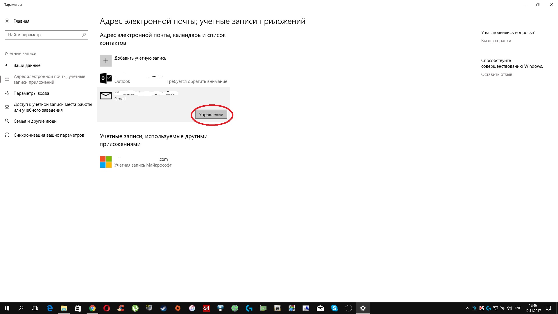 Не работает кнопка "Управление" в настройках учетных записей. После нажатия, на доли секунды появляется окно настройки и исчезает. То же самое, в приложении "Почта"