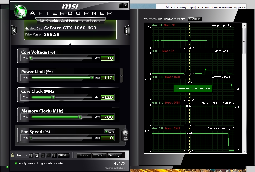 1. Для разблокировки разгона в файлеMSIAfterburner.cfg (Находится в папке, где установлена программа) необходимо прописать следующие значения: UnofficialOverclockingEULA = I confirm that I am aware of unofficial overclocking limitations and fully understand that MSI will not provide me any support on it UnofficialOverclockingMode = 1 2. Для разблокировки напряжения и его мониторинга в том же файле прописываем следующие значения: UnlockVoltageControl = 1 UnlockVoltageMonitoring = 1 (!)В драйвере Catalyst 12.2+ не хватает пары файлов, скачиваем здесь 3. Программа так же "умеет" отображать энергопотребление CPU и GPU в играх. ~ Для этого в Настройках (Настройки > Мониторинг) нужно активировать пункты "Энергопотребление" и "Энергопотребление ЦП". 4. После перезагрузки или включения компьютера слетает профиль разгона. Как сделать, чтобы он грузился вместе с Windows? ~ Одно из решений тут - настройка автозапуска ~ Или штатный метод попробовать, описанный здесь 5. Выскакивает ошибка "В данный момент невозможно произвести внедрение в Diretc3D12 компоненты. Строго рекомендуется перезапустить приложение" Решение описано в этом посте 6. Шпаргалка по оформлению оверлейного дисплея от камрада y0121ck - ОСНОВЫ и ДОПОЛНЕНИЕ