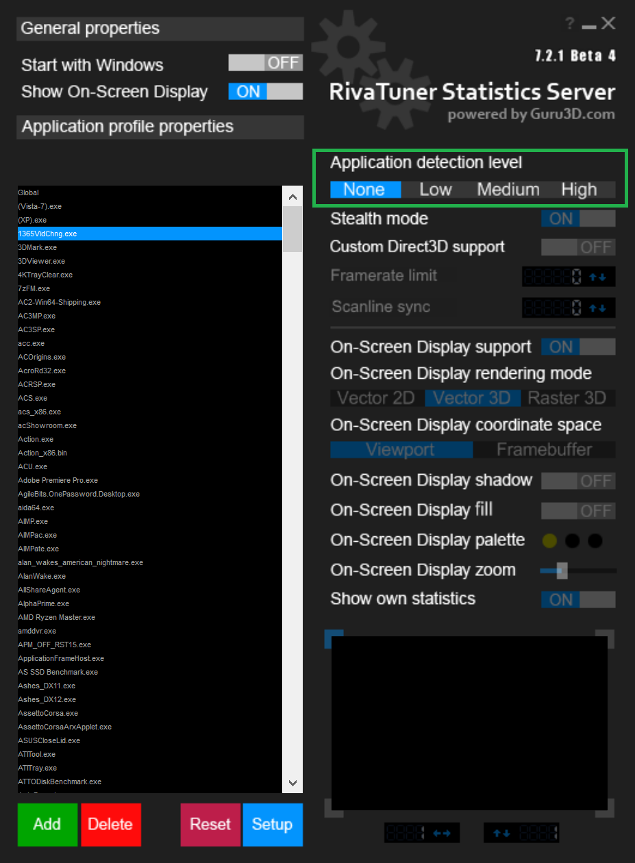 Стояла версия 4.2.0 на диске D - систему восстанавливал - но прога запускается. Потом обновил до 4.5.0 - доб новые функции - чтобы отображать например ср мин и макс FPS - включаю - не включается. То что есть работает... отключил - выключил. Например есть строчка VRAM RAM 1824 6784