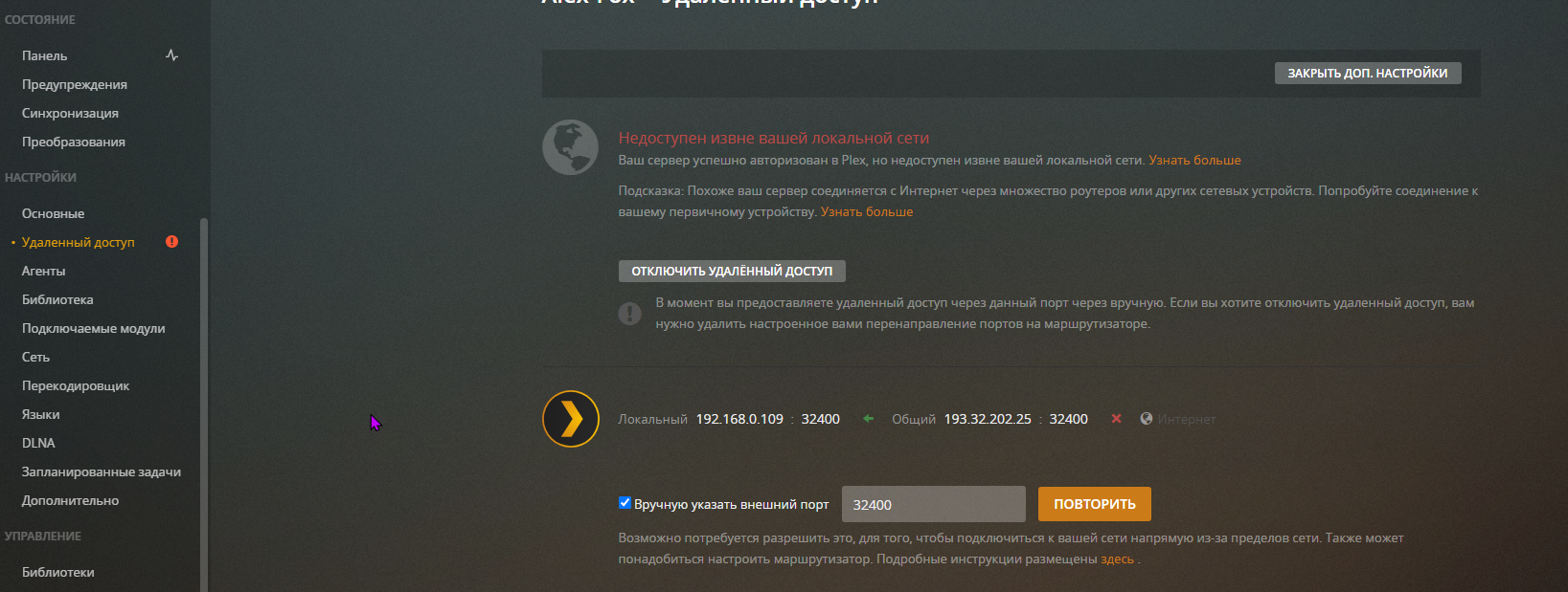 Привет! Переустановил ОС, и теперь Плекс чудит: не видит файлы компа, постоянно предлагает Загрузить Плекс медиа сервер, а он уже стоит... Сносил учетную запись, выходил из аккаунта, удалял с компа, перезагружался - ничего не помогает. Конфигурация не менялась, все железо тоже, только ОС другая на другом внешнем носителе. Прошу совета.