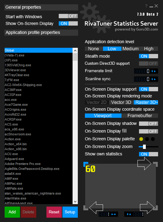 Вышла новая 7.3.0 beta3 версия RivaTuner Statistics Server с плагином, который позволяет в графическом режиме редактировать параметры оверлея RTSS.