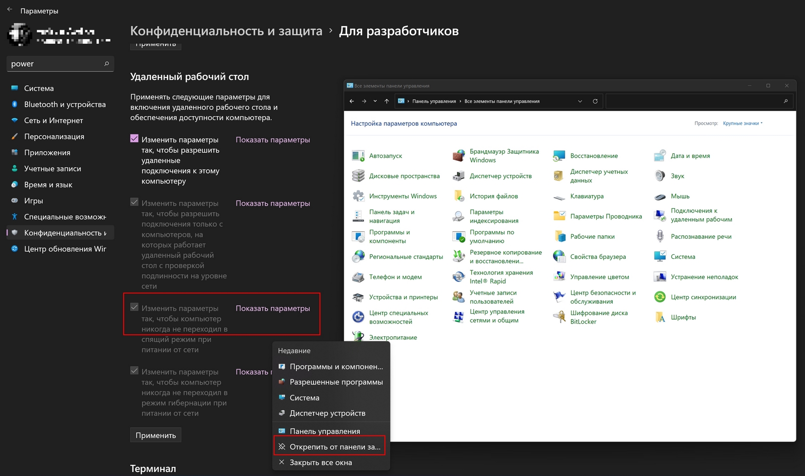 Случайно нарыл в 11 винде классическую панель управления. Начал в строке писка писать Power, в результате нашёл режим разработчика. А в режиме разработчика кликнул по - "Изменить параметр так, чтобы компьютер никогда не переходил в спящий режим", в итоге появилась классическая панель управления,далее перешёл в основное меню и закрепил её на панели задач.