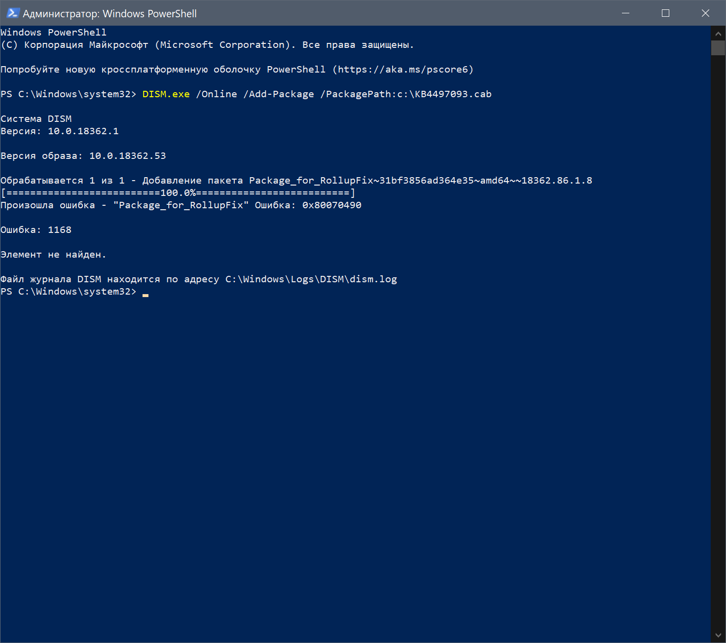 Вот такая фигня вылезла (код ошибки - 0x80070490) при попытки накатить кумулятивное обновление KB4497093