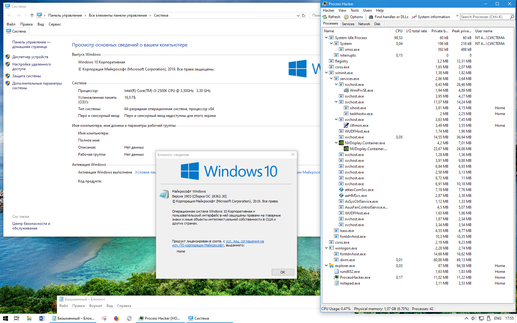 Установлена для теста 1903. Очищена от зла, отключены (некоторые удалены) все компоненты слежения/телеметрии, отключен магазин и удалены все мусорные предустановленные пакеты (осталось лишь тело магазина и несколько необходимых элементов для функционирования UI). Отключены патчи-спекулянты meltdown и spectre, отключены все антивирусные модули, отключены защитник и центр безопасности. Полностью отключено автообновление и все связанные с ним сценарии. Отключены все диагностические журналы и модули наблюдения за быстродействием системы. Отключено 127 служб, отключено (некоторое удалено) 104 задания в планировщике. Отключено сжатие оперативной памяти, отключены гибернация, быстрый запуск и swap, отключены проверка ide-устройств во время загрузки, отключены мониторинг производительности и авто-выбора DPI для всех процессов. Отключен троттлинг. Некоторые незначительные побочные эффекты. Как и у многих, не работает пункт "Приложения" в окне параметров (это связано с отключением некоторых служб и/или удалением модулей appx). Важность данного пункта в окне "параметры" отсутствует, т.к. доступ к установленным программам находится в традиционной панели управления, а для управления пакетами uwp существует Windows App Boss. Начиная с 1809, часть UI проводника была переработана и заменена на внешний модуль appx. В 1903 полностью переработана и работает за счет двух отдельных служб (StateRepository и AppXSVC), без них сыпятся элементы UI. Также, нет возможности полностью, без последствий отключить журналирование системы (на данный момент), теперь от EventLog зависят две сетевые службы (netproform и NlaSvc), без них сыпятся значок сетевого подключения в трее, некоторые сетевые настройки и зависящие от них службы. По сравнению с 1607, система загружается на 2 сек дольше, скорость работы, отклика и реактивность в целом на прежнем уровне. Редакторы графики, фотошоп, лайтрум, иллюстратор работают шустро. Игры не проверялись. Журнал событий во время запуска регистрирует всего 10 ошибок связанные с отсутствием в системе кортаны и эджа, несмотря на их полное отключение (вызов производится из реестра за счет модуля backgroundTaskHost, который в свою очередь пытается подгрузить компоненты в память, несмотря даже на то, что это запрещено в групповой политике). После запуска, в диспетчере висит 42 процесса, некоторые опциональные. Всего 33 системных процесса и получается выделено менее 1,07 гб ram. Система работает нормально, старые программы устанавливаются и работают.