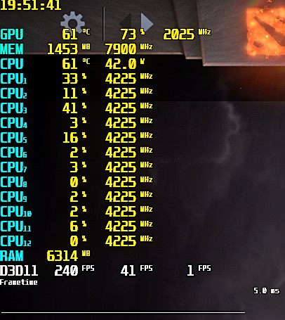 Не верно отображается частота кадров ниже 1% и 0.1% , отображает фиксированно по 25 и 7 фпс соответственно, но в некоторых играх и вовсе эти значения равны нулю, текущий фпс нормально отображает помогите если кто знает как решить это вот например фпс 240, а 1 и 0.1 отображают какой то бред