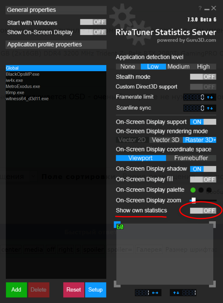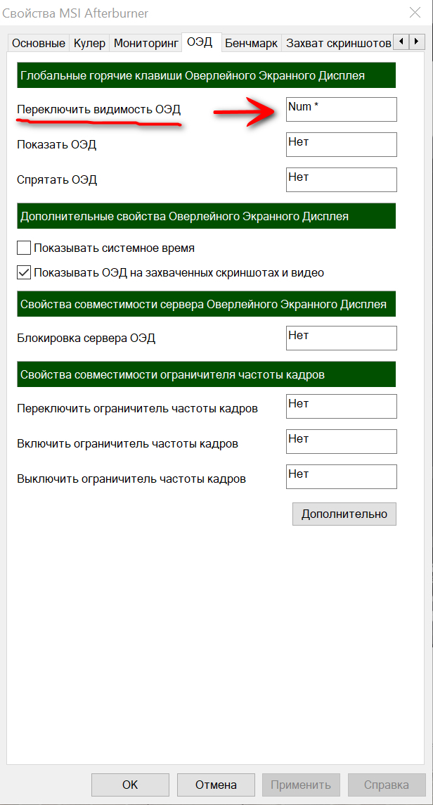 Причём, можно назначить как Global (по умолчанию), так и для каждого приложения/игры отдельно - отображать или нет при запуске. А в настройках MSI Afterburner назначить хоткей для переключения видимости ОЭД: