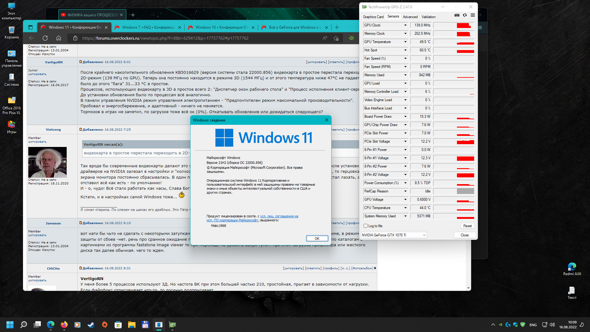 После крайнего накопительного обновления KB5016629 (версия системы стала 22000.856) видеокарта в простое перестала переходить в 2D-режим (139 МГц по GPU). Теперь она постоянно находится в режиме 3D (1544 МГц) и от этого температура ниже 47°С не падает, а было до этого "бага" 31...33 °С в простое.