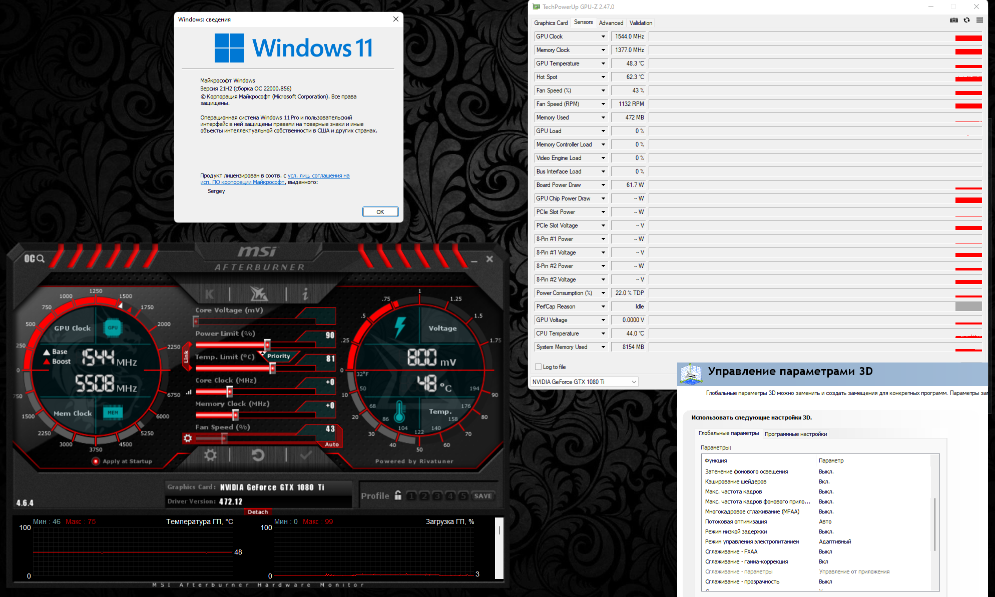 После крайнего накопительного обновления KB5016629 (версия системы стала 22000.856) видеокарта в простое перестала переходить в 2D-режим (139 МГц по GPU). Теперь она постоянно находится в режиме 3D (1544 МГц) и от этого температура ниже 47°С не падает, а было до этого "бага" 31...33 °С в простое. Процессов, использующих видеокарту в 3D в простое всего 2: "Диспетчер окон рабочего стола" и "Процесс исполнения клиент-сервер". До установки обновления было по процессам всё аналогично. В панели управления NVIDIA режим управления электропитанием - "Предпочтителен режим максимальной производительности". Пробовал и энергосбережение, и адаптивный - ничего не меняется. Тормозов в играх не заметил, по загрузке тоже всё ок (0%). Откатывать обновление или дожидаться следующего?