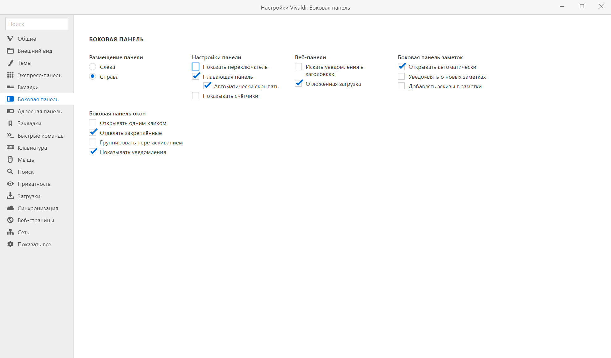 Shpankov добавление по боковой панели. С галочкой показывать переключатель тоже глючит. Прямо сейчас страница выглядит так - https://habrastorage.org/webt/4d/0c/kx/ ... nijws.jpeg т.е. боковой панели спарва по факту нет. Есть только тонкая полоска с переключателем. Что бы попасть например в заметки, надо кликнуть переключатель, откроется боковая панель - https://habrastorage.org/webt/1q/rv/kp/ ... facr0.jpeg только не на заметках а на загрузках, после этого кликаем на значке заметок, работаем с заметками, например копируем текст из заметки в буфер, переносим курсор на страницу, в поле ввода, после клика там, боковая панель с открытой заметкой, опять сворачивается в полоску переключателя (первый скрин). Чтобы попасть в заметки опять надо кликать переключатель или жать F4 и т.д. Панель появляется только когда кликается переключатель, а он должен именно переключать - спрятана панель или представлена в виде вертикальной полоски со значками приложений.