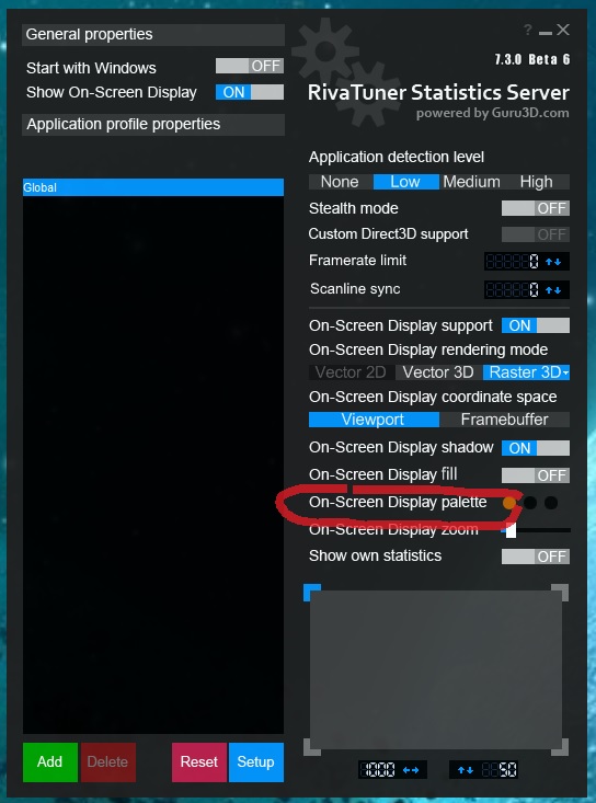 Народ, кто-нть знает как поменять цветовую палитру отображения статистики на экране в "rivatuner statistics server"? Любой цвет ставлю, в меню rivatuner изменяется, а в играх всё равно поумолчанию жёлтый. Раньше был розовый цвет и 99% играх всё было видно, жёлтый часто сливается с фоном. Только не предлагайте включить тени.