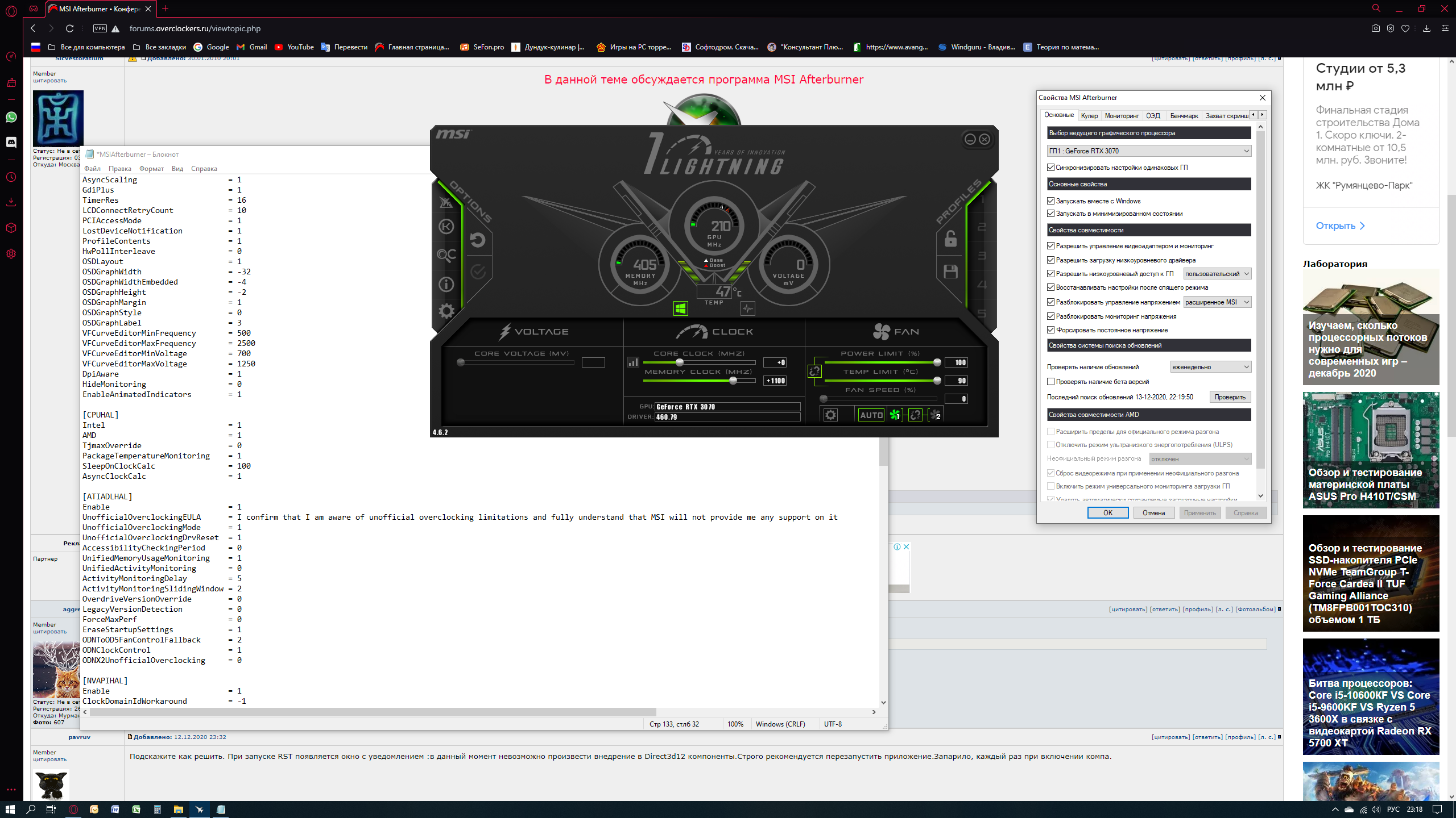 1. Для разблокировки разгона в файлеMSIAfterburner.cfg (Находится в папке, где установлена программа) необходимо прописать следующие значения: UnofficialOverclockingEULA = I confirm that I am aware of unofficial overclocking limitations and fully understand that MSI will not provide me any support on it UnofficialOverclockingMode = 1 2. Для разблокировки напряжения и его мониторинга в том же файле прописываем следующие значения: UnlockVoltageControl = 1 UnlockVoltageMonitoring = 1 (!)В драйвере Catalyst 12.2+ не хватает пары файлов, скачиваем здесь 3. Программа так же "умеет" отображать энергопотребление CPU и GPU в играх. ~ Для этого в Настройках (Настройки > Мониторинг) нужно активировать пункты "Энергопотребление" и "Энергопотребление ЦП". 4. После перезагрузки или включения компьютера слетает профиль разгона. Как сделать, чтобы он грузился вместе с Windows? ~ Одно из решений тут - настройка автозапуска ~ Или штатный метод попробовать, описанный здесь 5. Выскакивает ошибка "В данный момент невозможно произвести внедрение в Diretc3D12 компоненты. Строго рекомендуется перезапустить приложение" Решение описано в этом посте 6. Шпаргалка по оформлению оверлейного дисплея от камрада y0121ck - ОСНОВЫ и ДОПОЛНЕНИЕ