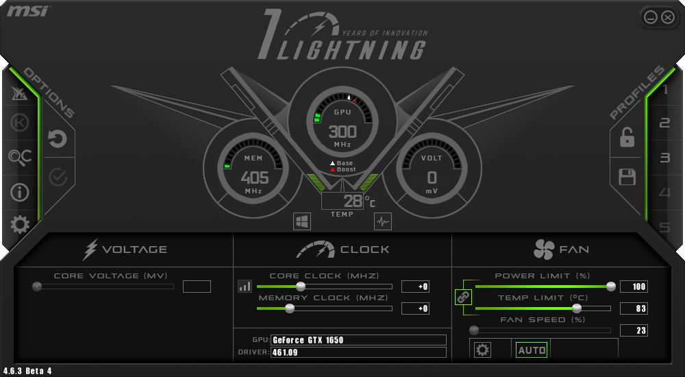 Potap4ek Да MSI AF надо все что накручено сбросить и от этого отталкиваться. В моей MSI GeForce GTX 1650 4GB GDDR6 на TU116 минимальные обороты зашиты 23% - это реально тихо.
