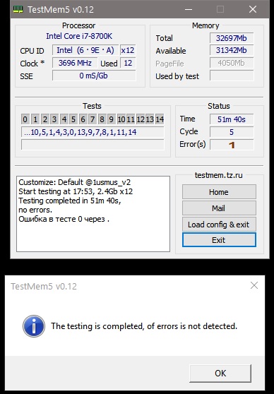 Дополню, подскажите, что может быть, глюк программы или что крутить. Сейчас тестирую по одной плашке DDR4 Samsung BB1-BCPB. Проц 6600к, разгон снизил для верности. Память 3000-14-15-30-1@1,35 IO 1,15, SA 1,2 Если тестировать по умолчанию, в 3 цикла, то первый прогон без ошибок, второй запуск программы - в конце работы ошибка в 4 тесте, время не указывается. Если поставить 10 циклов, то ошибка, ровно одна, возникает в 4 цикле, тоже а тесте 4.