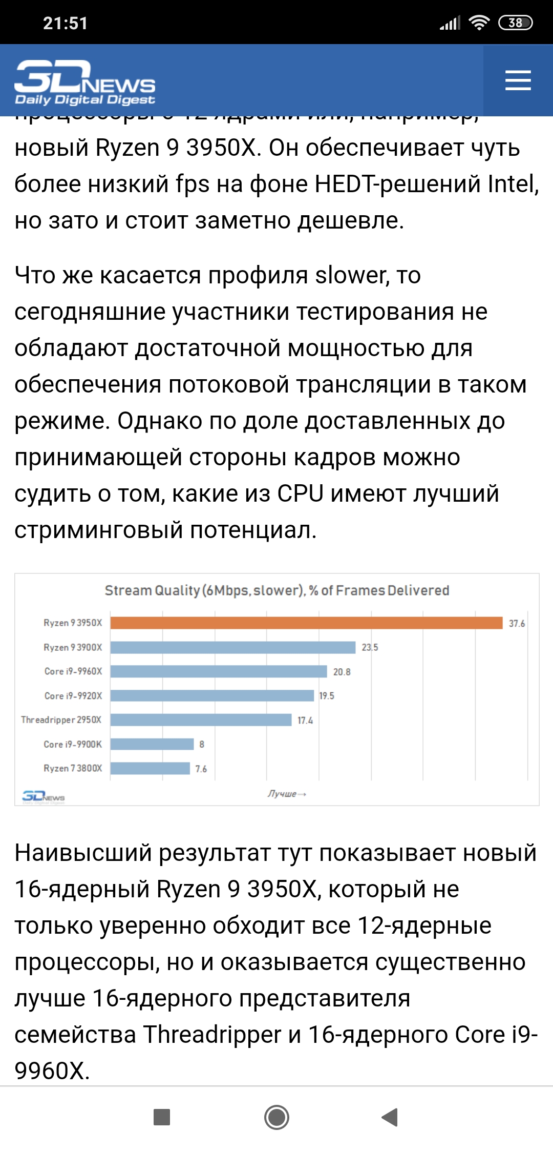 Обидно)) а что вытянет? 3900х, или уже только 3950х брать? И что может кодировать тот же slower и placebo? А если попробовать замахнуться на 2к с этими пресетами? Просто инфы вообще нет в инете конкретной, простите, что мучаю, зато потом люди увидят эту ветку, и найдут ответы)) Я просто смотрел еще тесты на 3dnews, они там писали, что 9900к спокойно вывозит и игру и стрим на слоу, но что-то мне уже не верится в это))) И, что будет лучше внешне, medium+high+ландшот в 1080, против slow+main+бикубический в 1080? Мне кажется, slow очень сильно прибавляет, или мне показалось? И, что будет лучше тот же слоу не на максималках в 1080, или медиум, но с апскейлом до 2к?