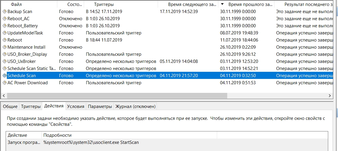 хоспаде Это какая свалка от Win10, гарантирующая мне сотней триггеров получение последних апдейтов системы. Осторожно, на скрине шок контент. Есть желание удалить нахрен всю эту папку "Оркестратора". Эти "Пользовательский триггер" неудаляемые и подробности их не показываются. Их по нескольку штук на задачу. Три последние задачи - одно и то же действие, четвёртая - загрузка обновлений. Выше есть ещё триггер на инсталляцию апдейт центра, видимо, на случай войны. Жесть какая