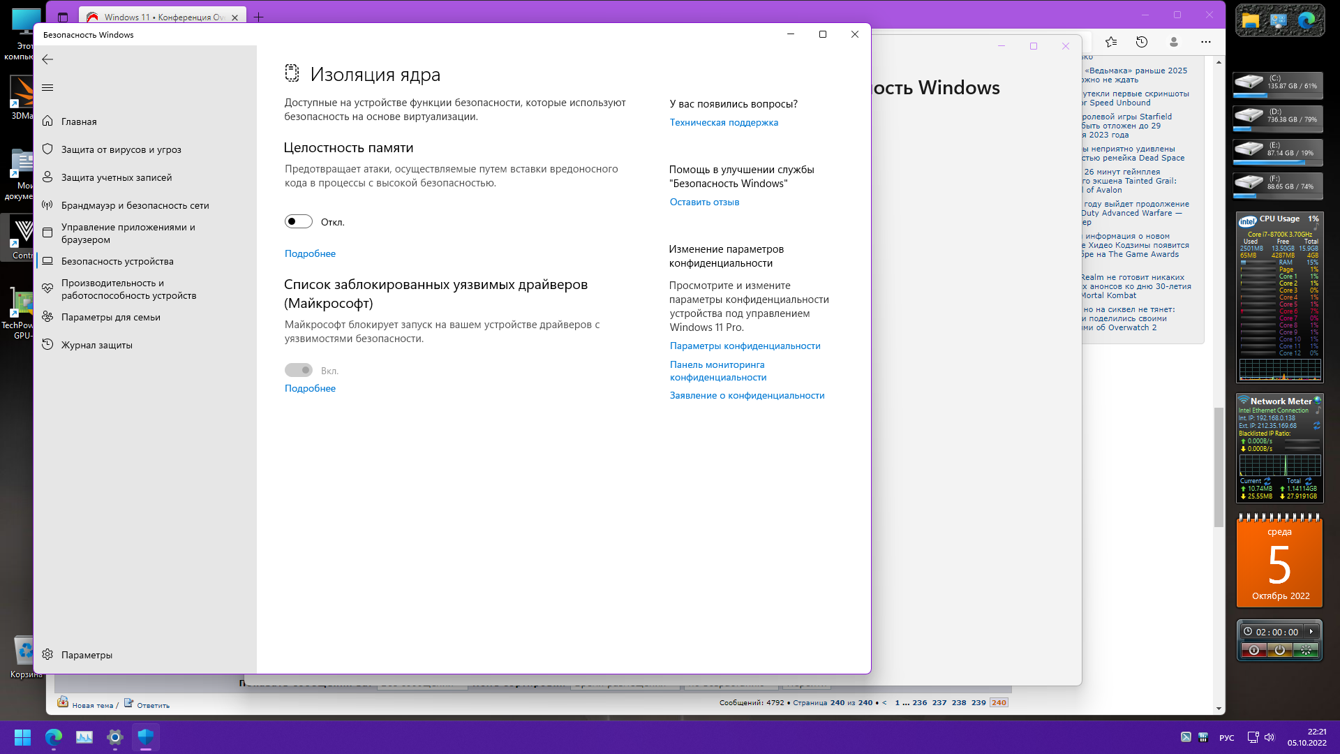 Agiliter, сейчас проверить не могу, но у меня вроде так вообще нет пункта изоляции ядра, виртуализацию тоже отключаю. F22, мне это просто не нужно, зачем включать то, чем не пользуешься? Я, наоборот, лет 7 уже вообще без антивируса сижу. Лучше отклик.