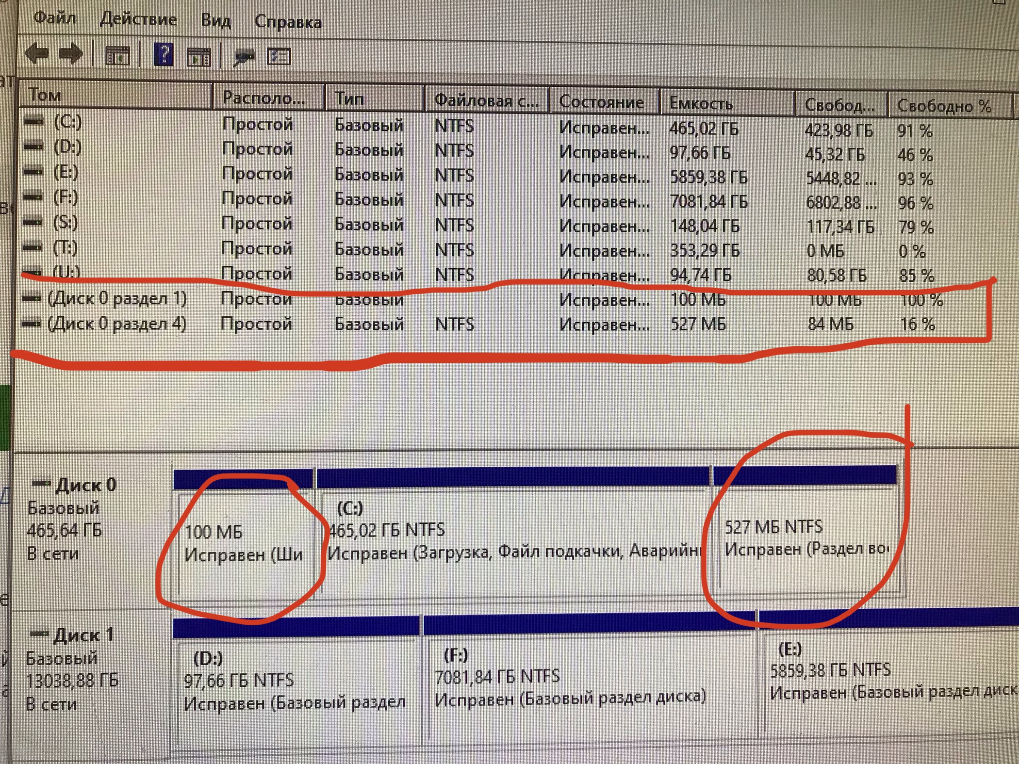 XIMERA123 не вижу полной инфы по дискам в колонке "состояние"!!! Раздел 527мб очень напоминает кусочек, что делает Винда при обновлении на новый билд... если это именно оно и есть, то присоединить его дело нескольких секунд. Насчёт 100мб (ши - не знаю что это... гадать угадывать не буду.